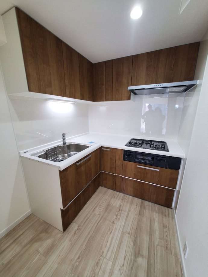 キッチンはフロアのベージュと同系色のブラウンにお色合わせ。