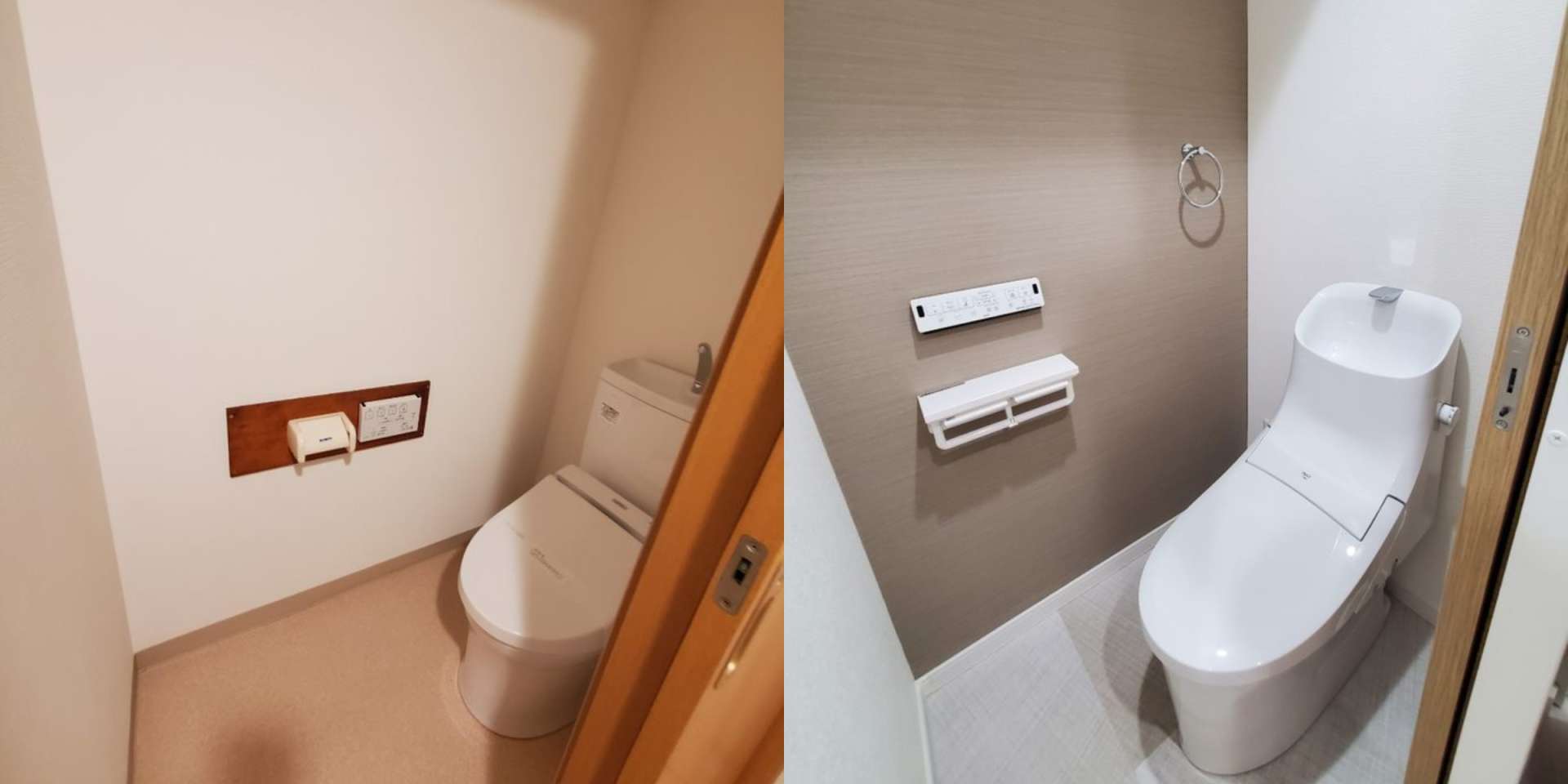 トイレ本体のお取替えとクロス貼替、タオルループも備え付け オシャレで落ち着ける空間に。