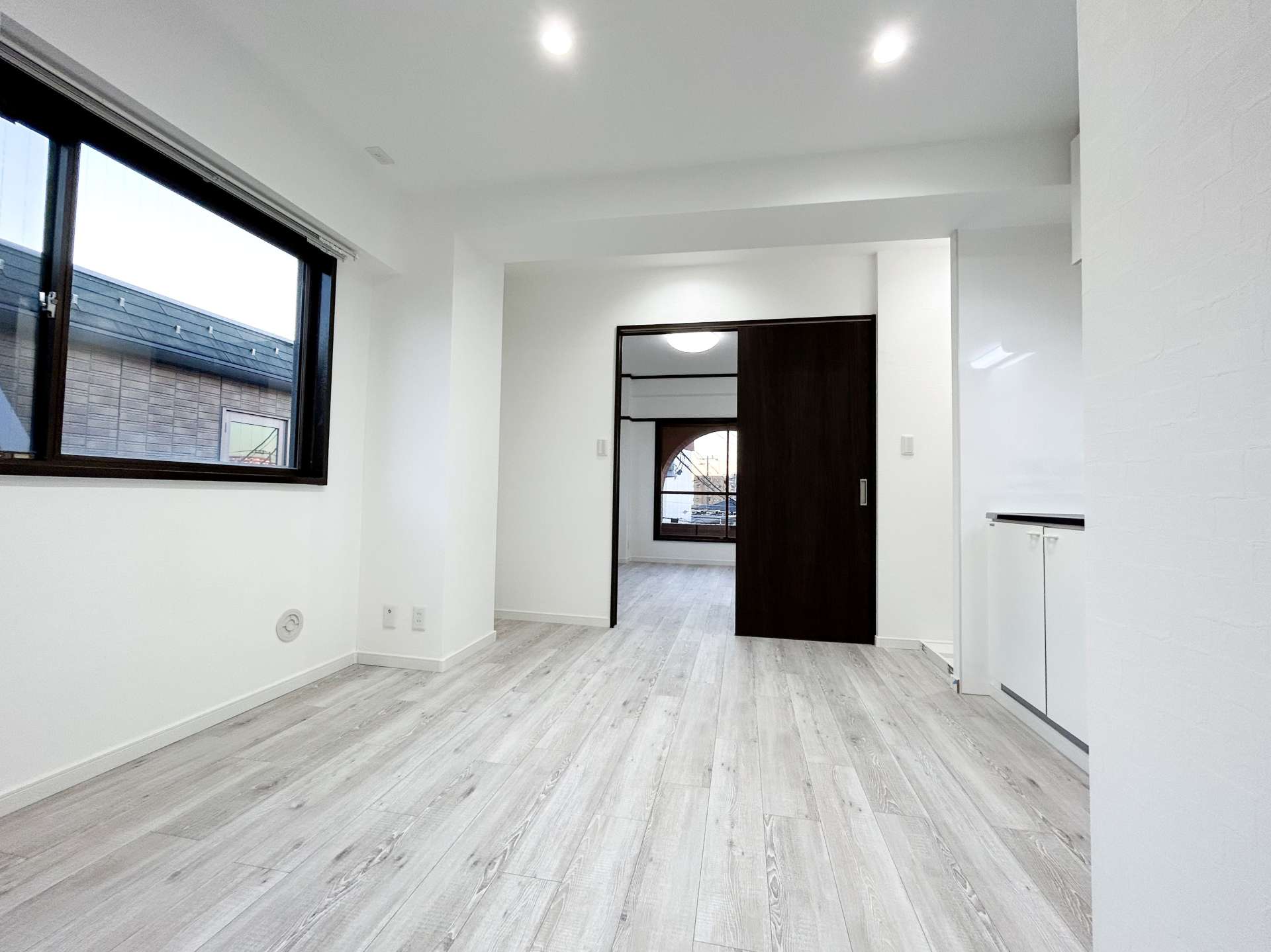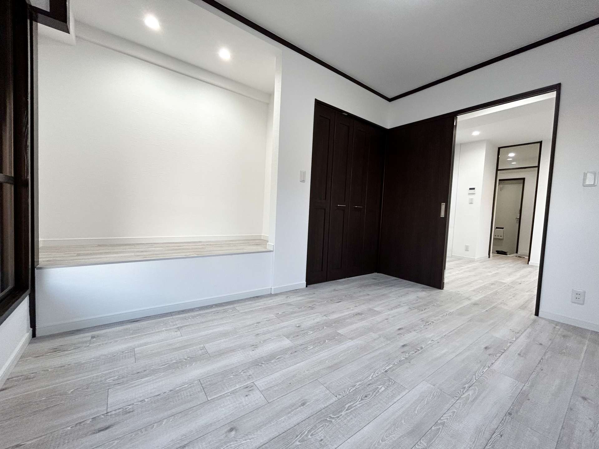 引き戸を右側に開けると、ダークブラウンのクローゼットと繋がったように見えますよね。