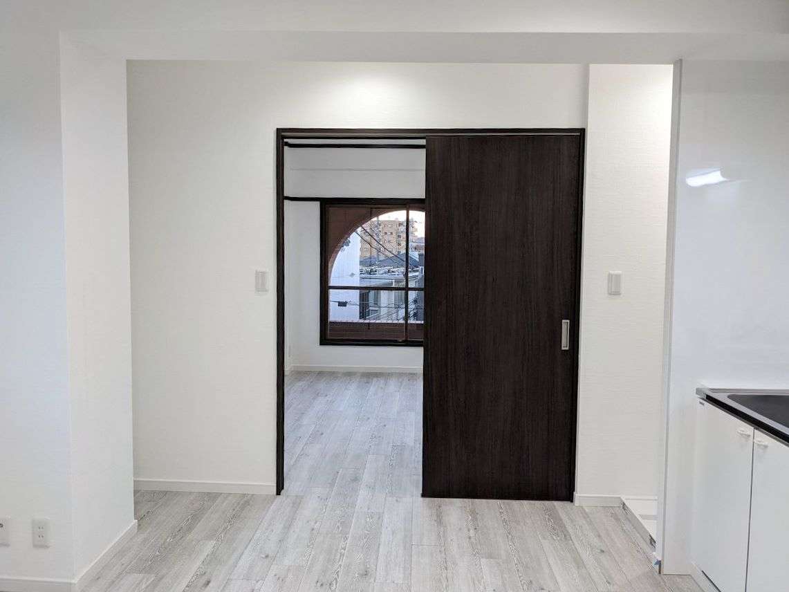 キッチンから見える洋室、モノトーンコーディネートが引き立ちます。