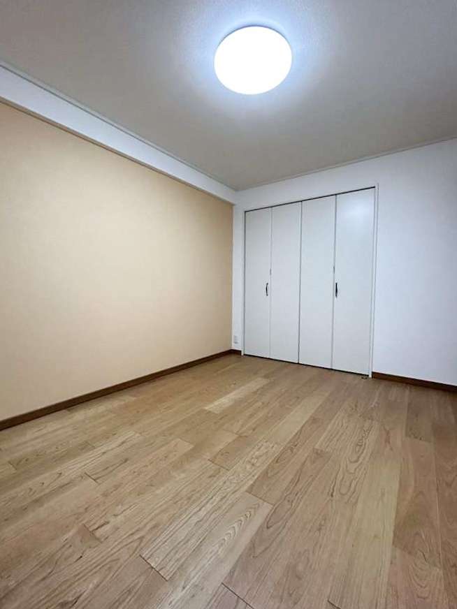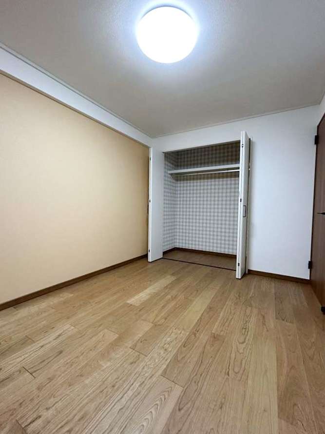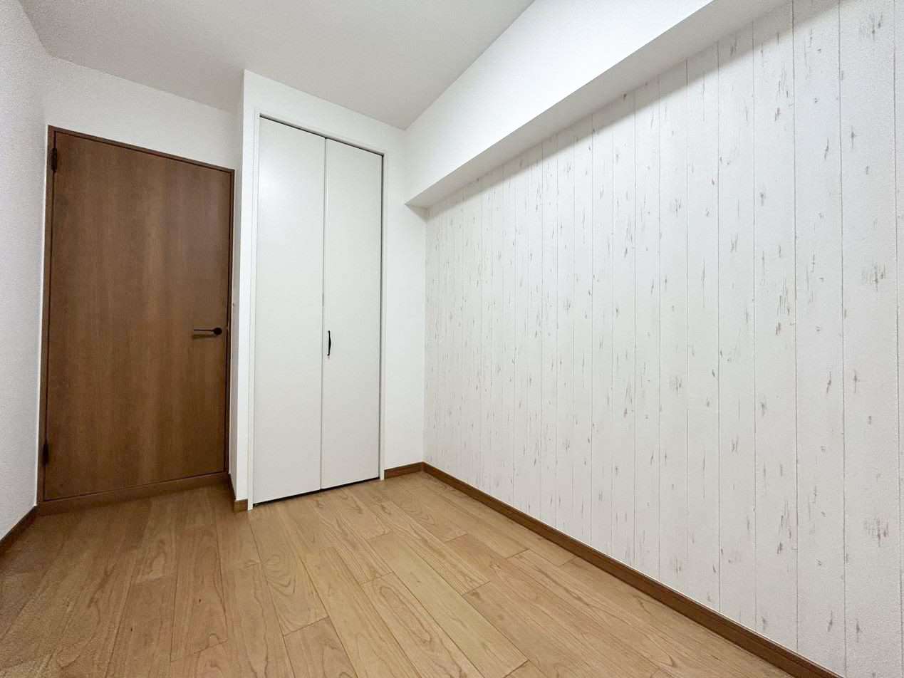 お次は洋室です。アクセントクロスがホワイトウッド調でとてもオシャレですね。