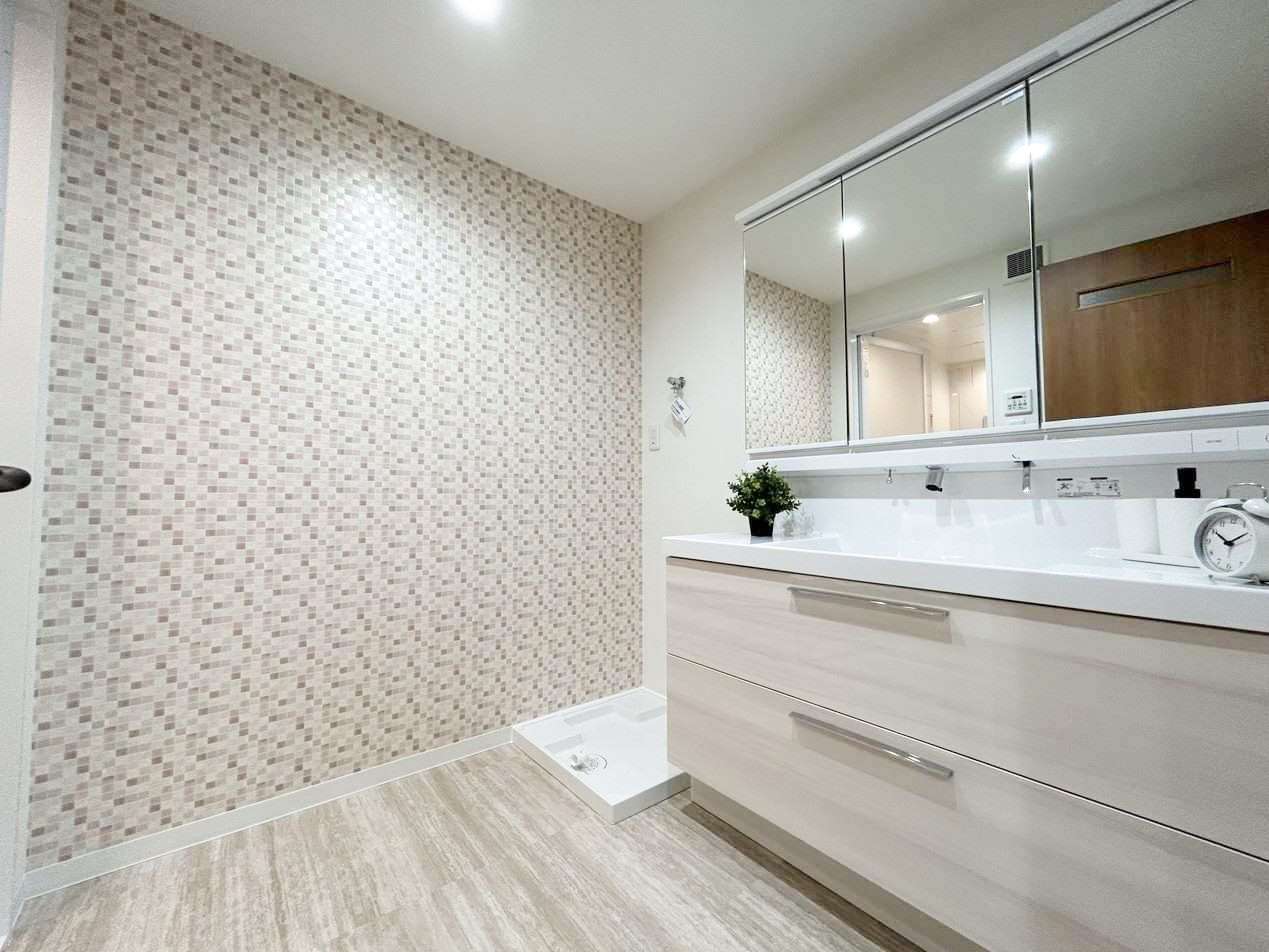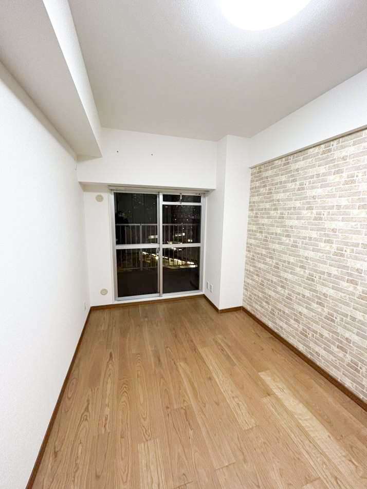 右側のベージュレンガ調の壁紙がとてもかわいいです。