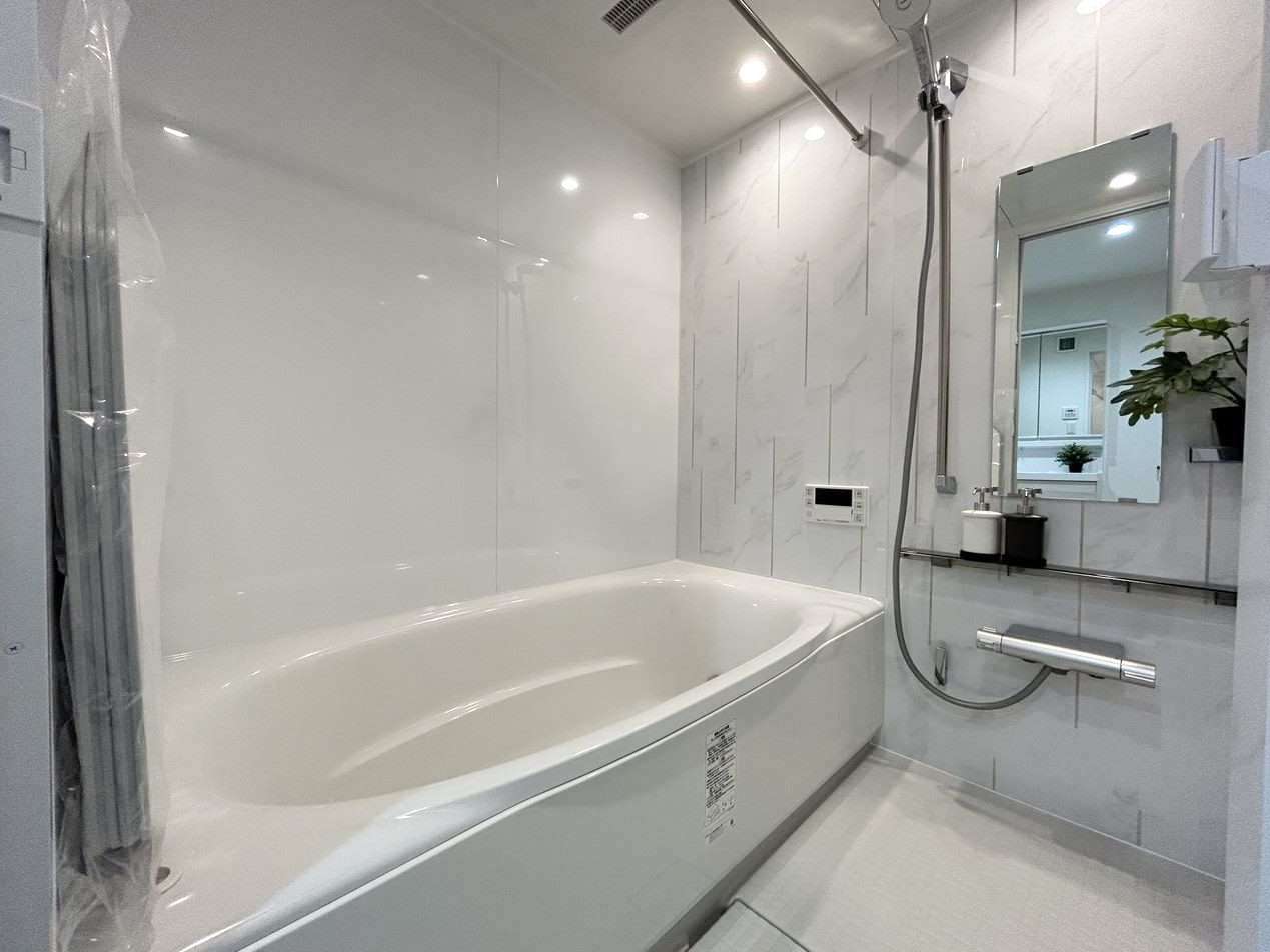 お次はユニットバスです。グレーとホワイトの大理石状の柄、高級感があり人気のデザインです。
