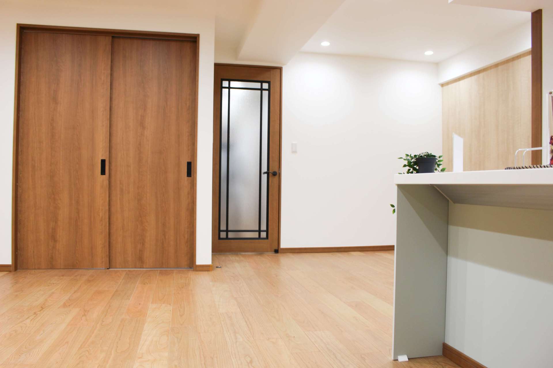 こちらのウッド調引き戸は巾木やリビングドアと色合わせをしました。