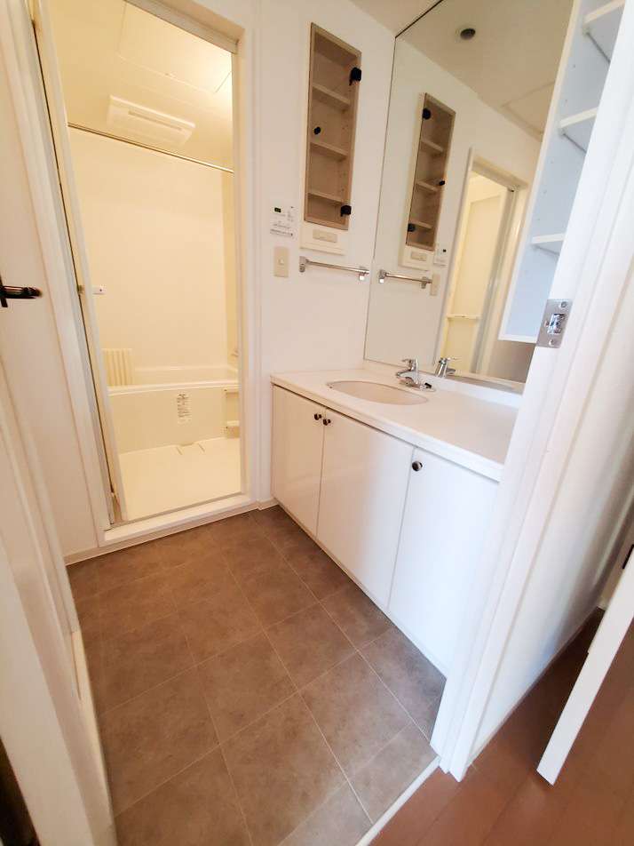 洗面所の脱衣所箇所はクッションフロアをしき、洗面台はクリーニング。