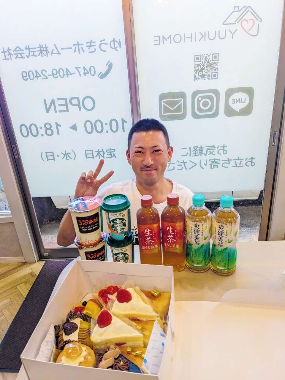 今回は、ゆうきホームファミリーの大久保さんが、ゆうきホームの事務所にたくさんのケーキや、お茶、コーヒーなどの差し入れを持ってきて下さいました!