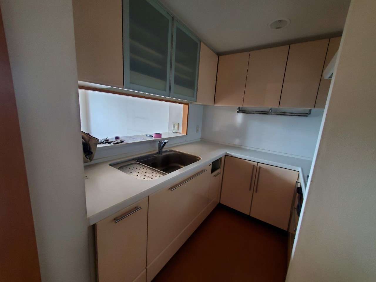 平成で流行した上棚がぐるっと囲っているキッチン。収納が多くて便利ですが、暗くて空調も届かず、真夏の料理中は灼熱地獄とも言われているのが平成キッチンですね。