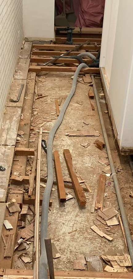 様々な要因が考えられたため、今回は廊下から玄関までを床上げ工事からやり直す方法となりました。