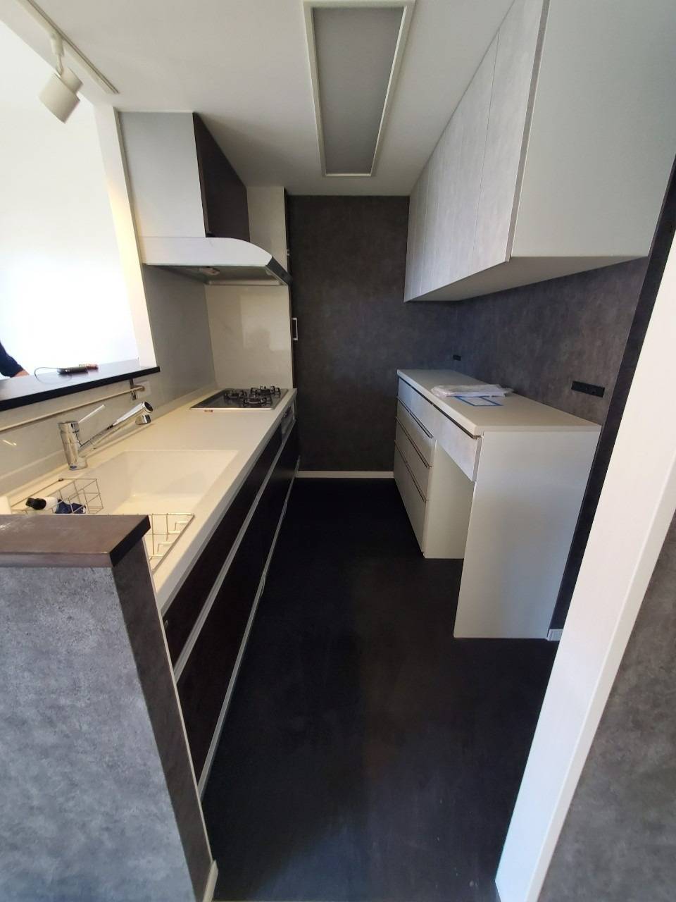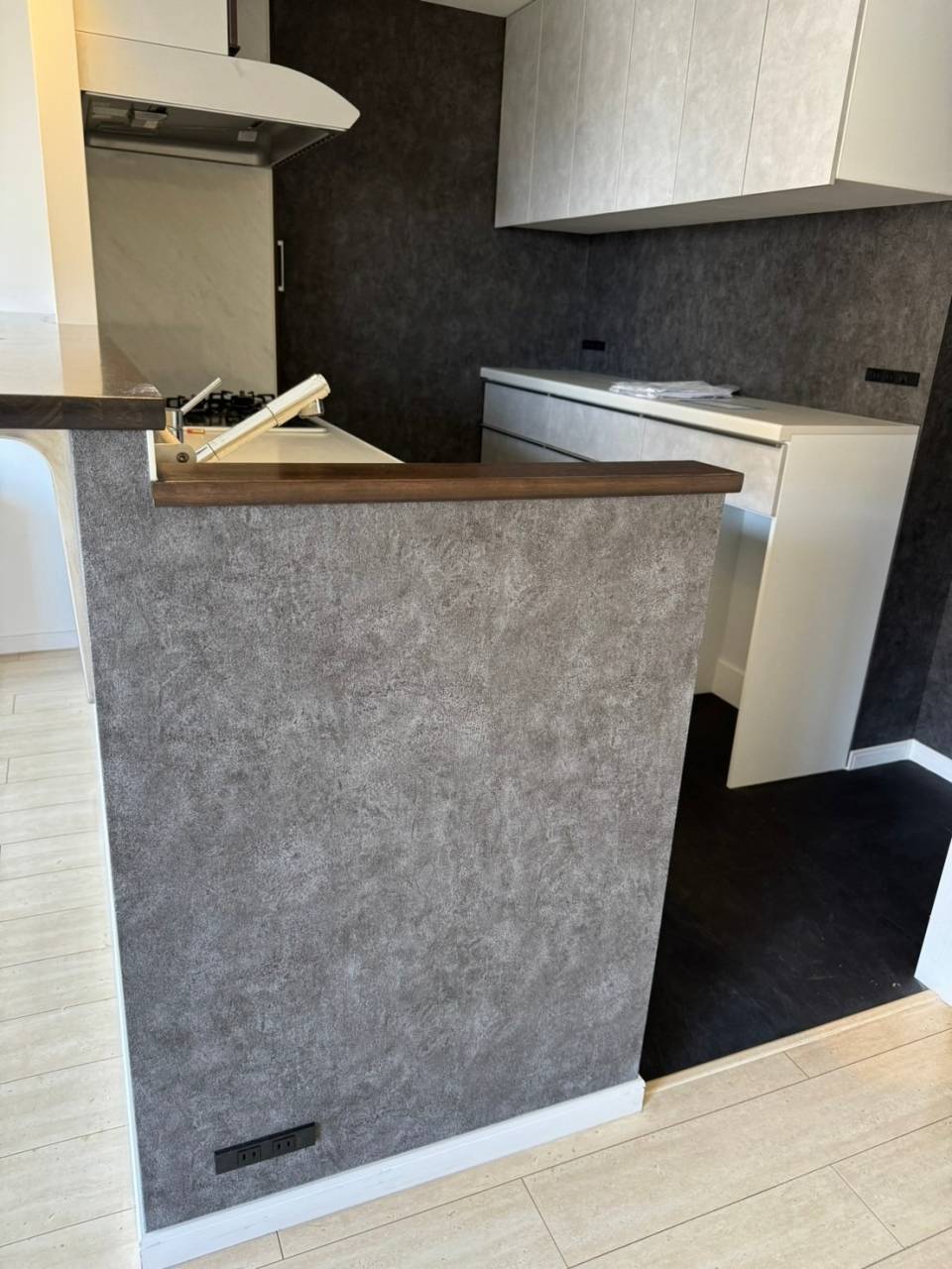 キッチンに入る両サイドとキッチンの中壁、キッチン奥行きも同じ壁紙クロスで統一。こちらもお客様の御要望のもと、施工させていただきました。