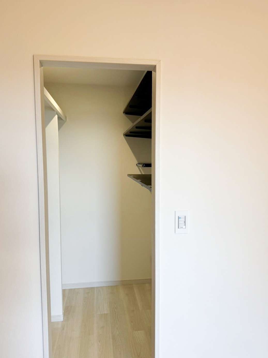 こちらのクローゼットはもともと扉がついていたのですが、お客様からのオーダーで扉を無くし、入口の開口部を少し小さくいたしました。