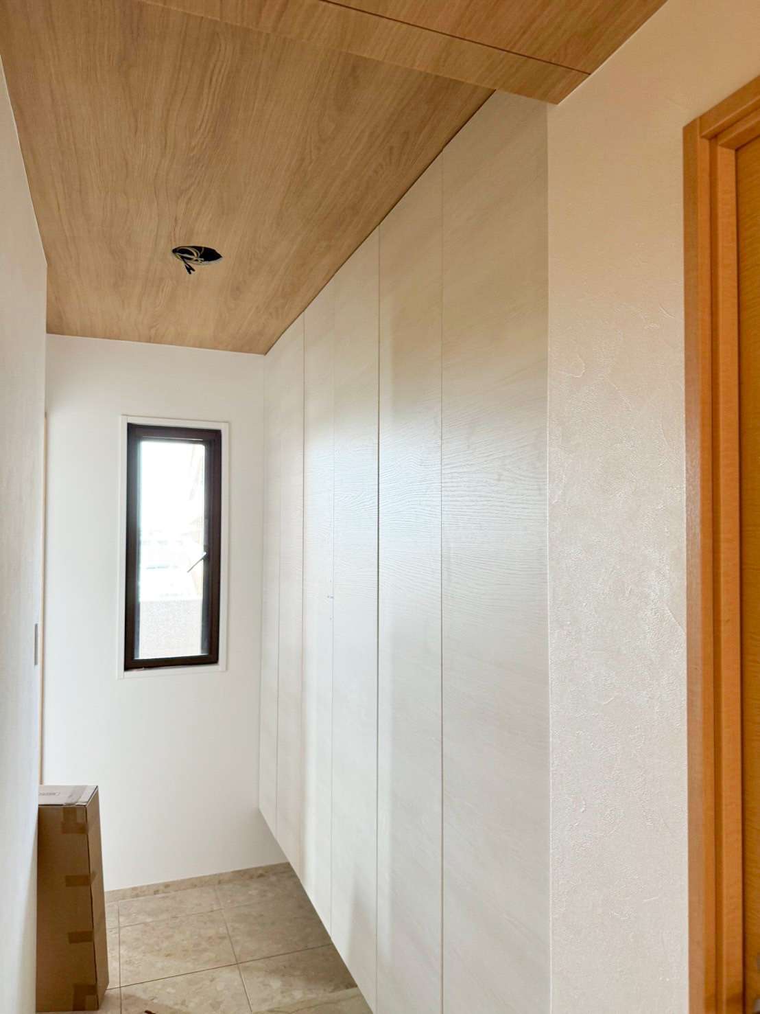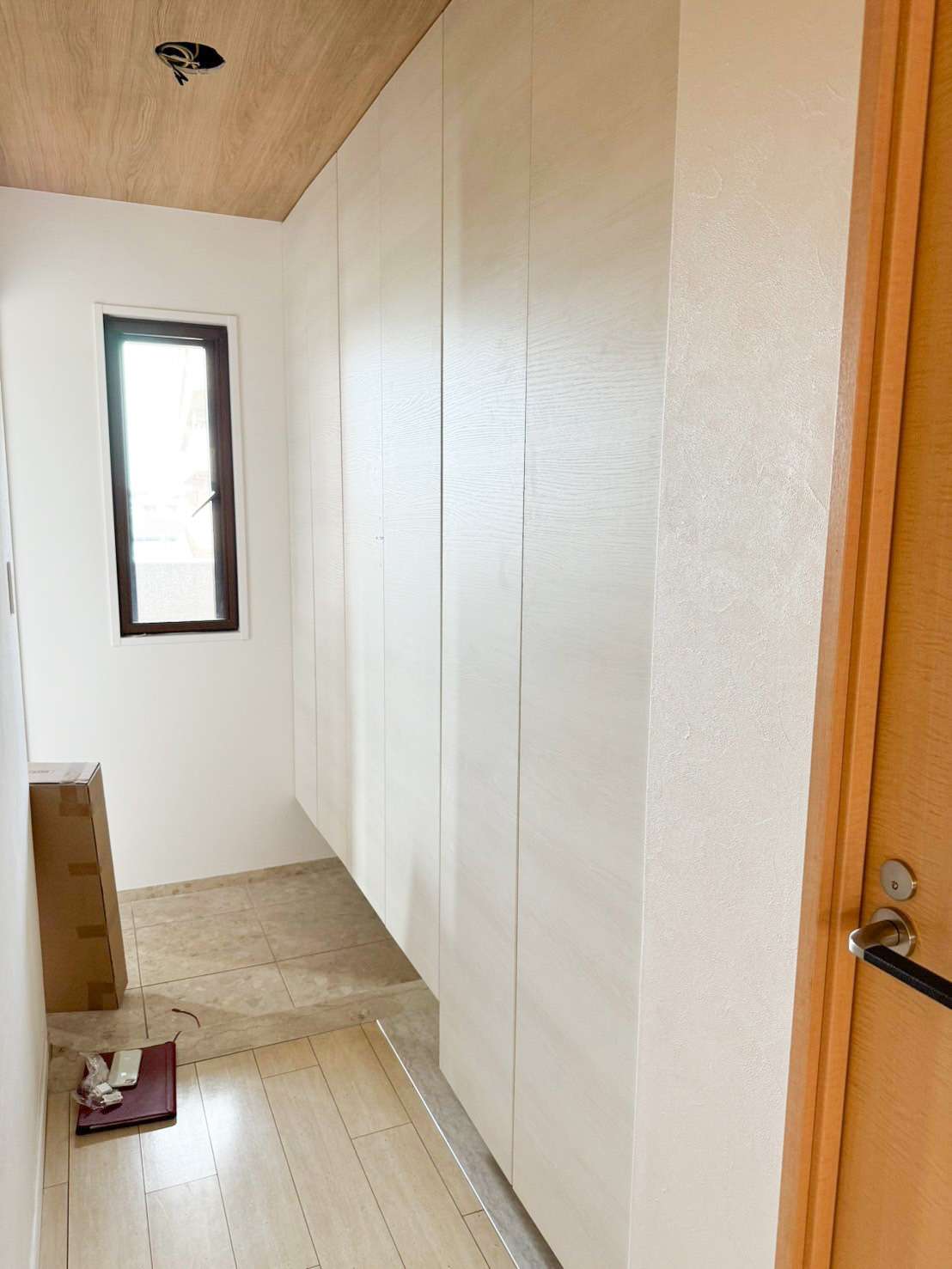 いかがでしょうか。玄関収納・シューズクローゼットが窓際の壁からドアまでピッタリ、シンデレラフィットで収まりました。