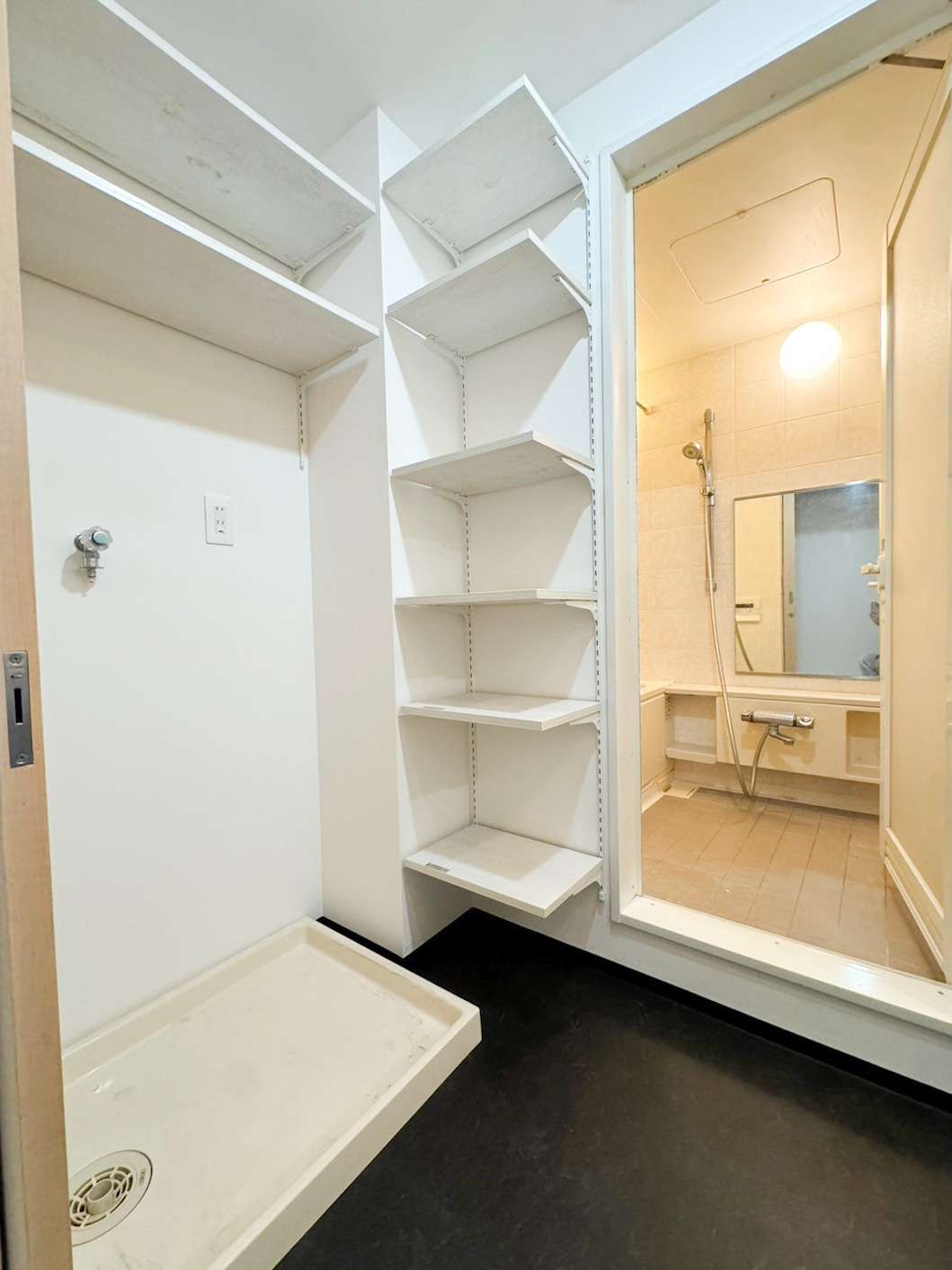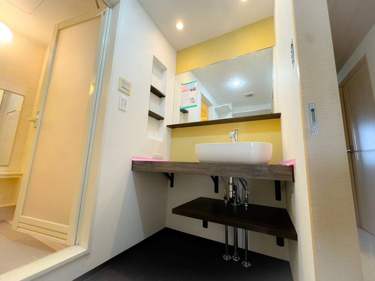 浴室と脱衣所はハウスクリーニング、壁紙クロス張り替え、また、新たに可動式棚を施工し