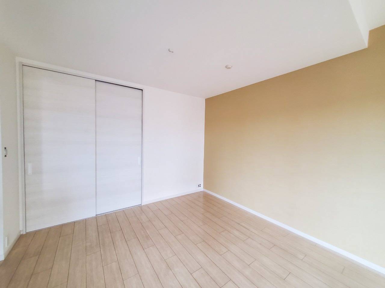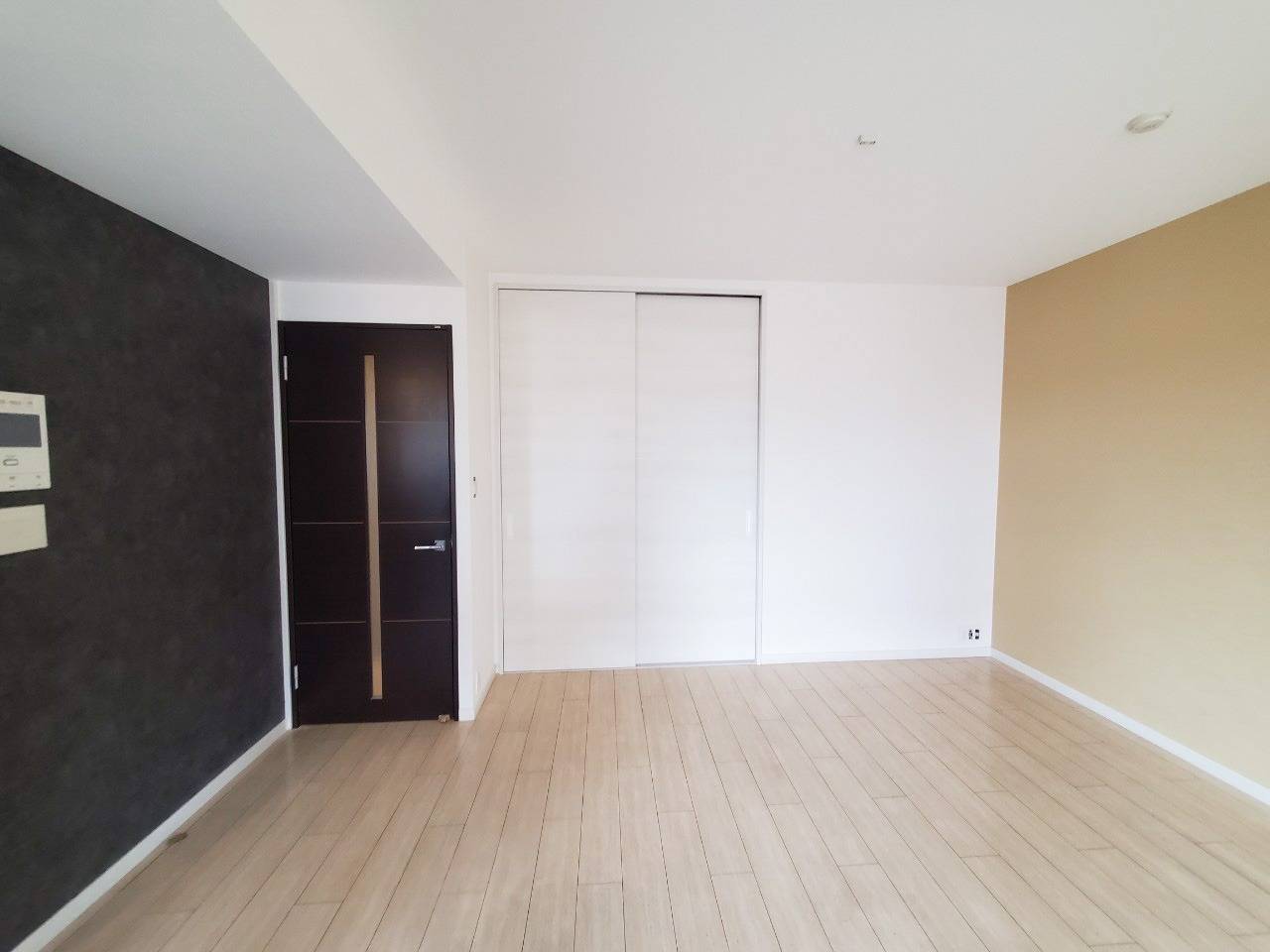 ベージュのフローリングとベージュアクセントクロスの相性がベージュで統一されていて相性が抜群です。