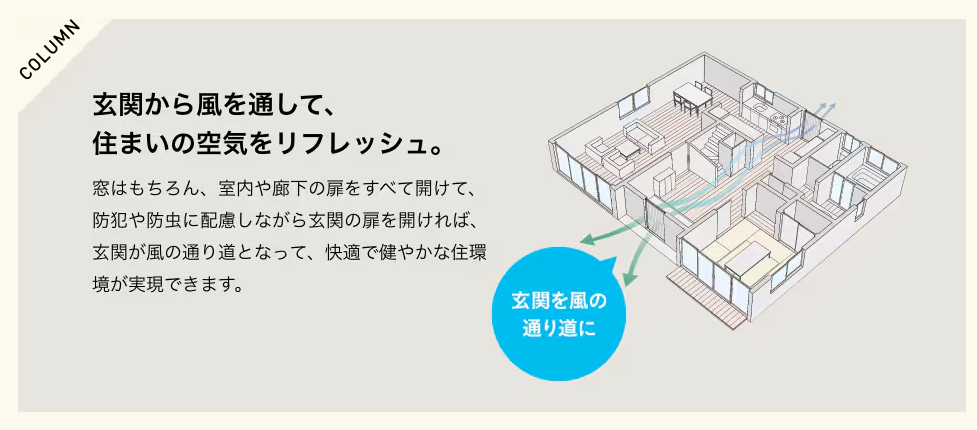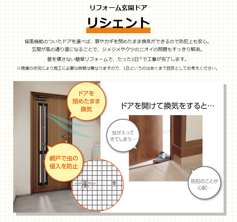 採風玄関ドアへの交換は1日のリフォームで簡単に行うことができ、窓とあわせて玄関にも風の出入口をつくることで、住まい全体に風の通り道をつくることにも繋がります。