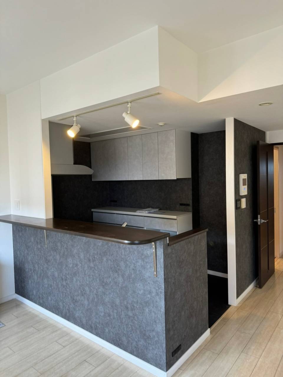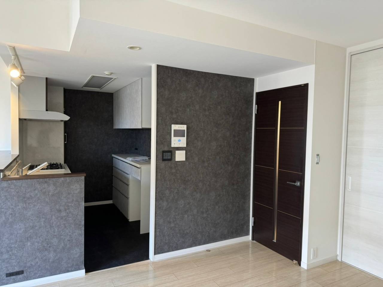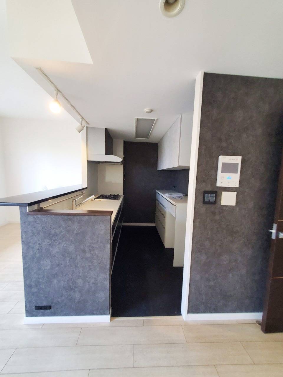 キッチンに入る両サイドとキッチンの中壁、キッチン奥行きも同じ壁紙クロスで統一。こちらもお客様の御要望のもと、施工させていただきました。