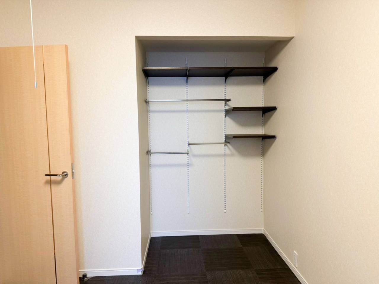収納をニッチ風にすることにより、急遽見せる収納を隠したいとなった場合も想定し、お客様お1人でも突っ張り棒でカーテンをつけられるように幅や奥行きの長さを工夫いたしました。もちろん後付けでカーテンレール、クローゼット戸をつけることも可能です。