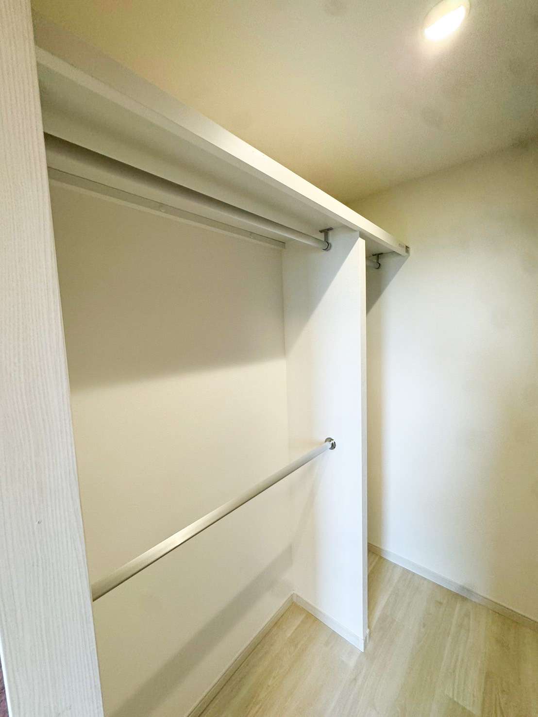 クローゼットの中は広々しています。左側はハンガーメイン、右側は可動棚。こちらもお客様のオーダーメイドで施工しました。