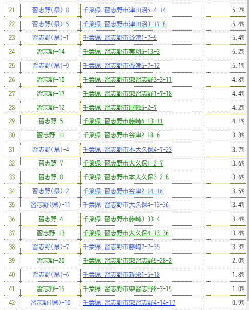 上記の習志野市地価ランキングと、左側の地価ランキングマップをご覧いただけるとわかりやすいかと思います。
