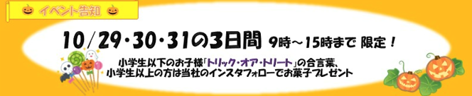 小学生以下のお子様「トリック・オア・トリート」の合言葉 、小学生以上の方は当社のインスタフォローで