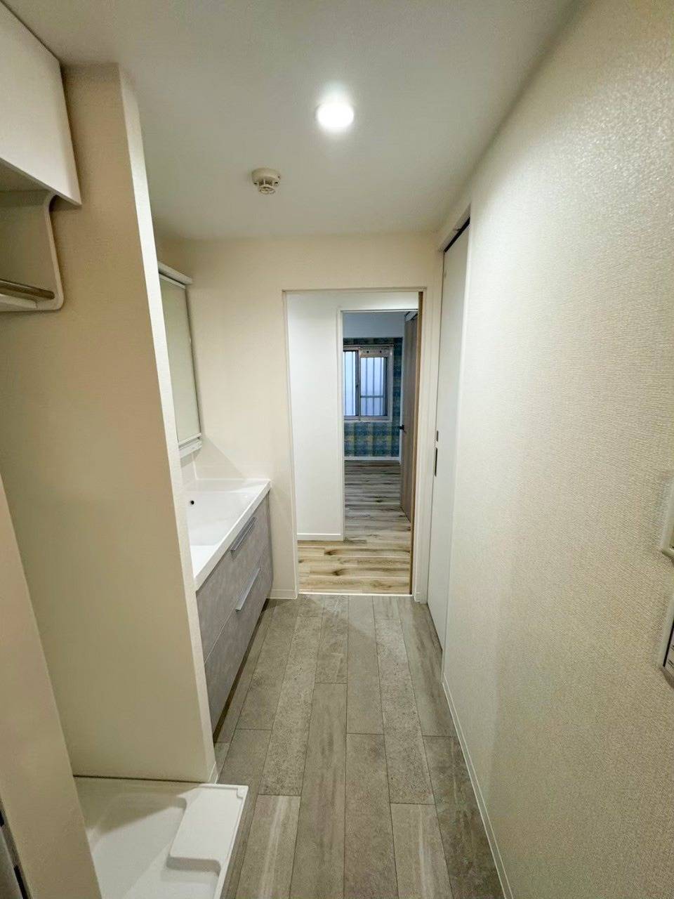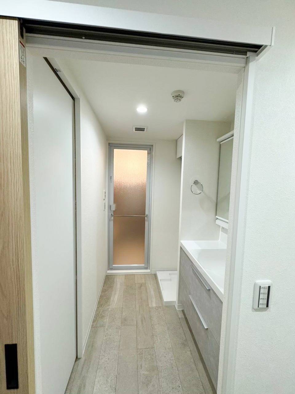 引き戸を開けるとオシャレなグレーベージュ調のランドリールーム。