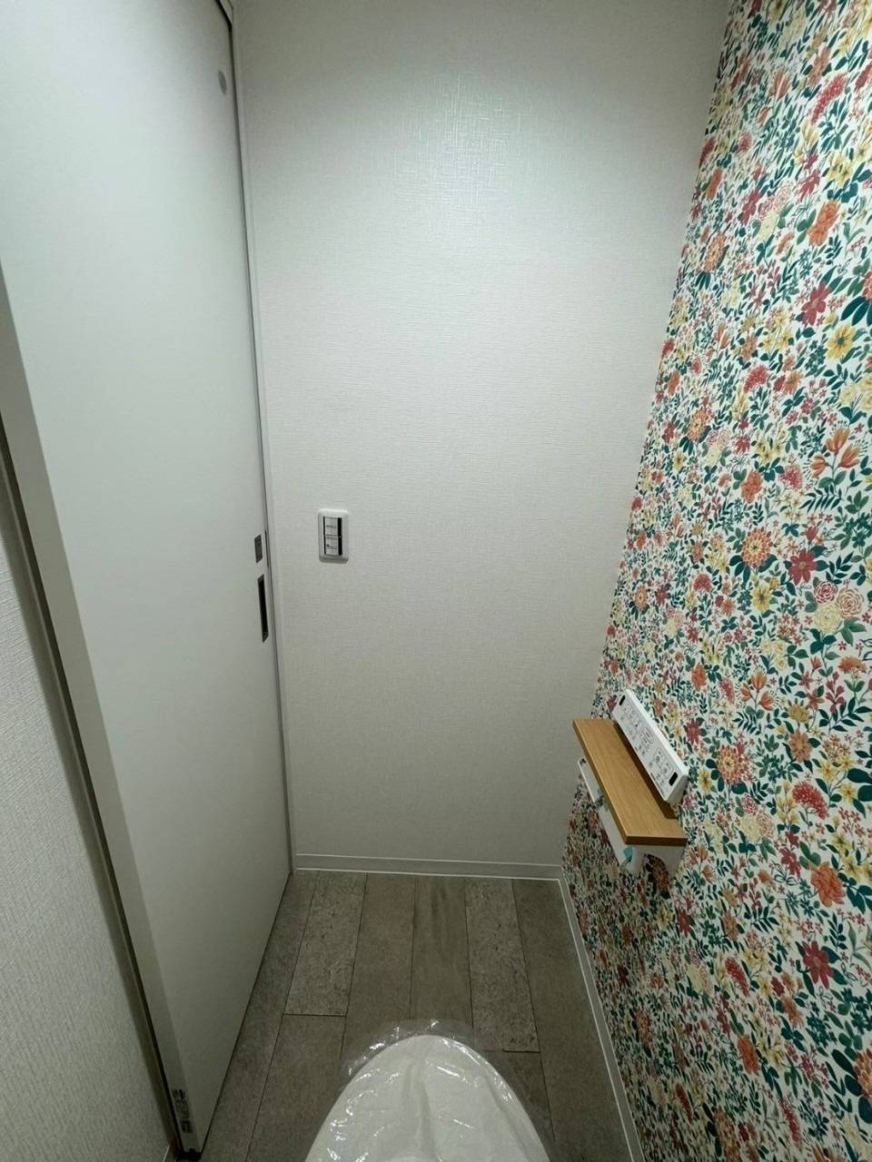 側面だけ花柄壁紙クロスを採用し、トイレ引き戸を開けた瞬間にお花畑が広がります。