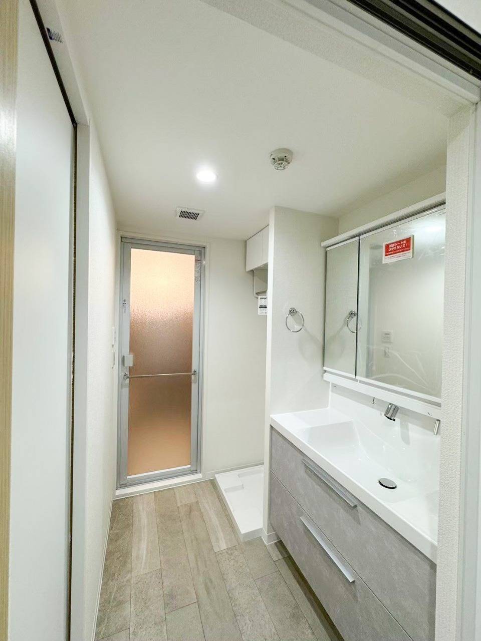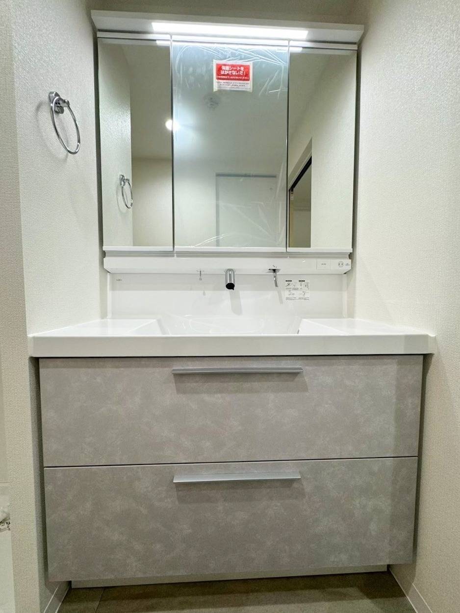 洗面化粧台は上品なグレーに。 ※洗面化粧台【品番】LIXIL クレヴィ スタッコグレー
