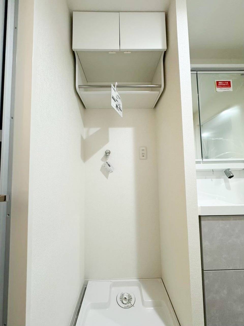 洗濯機置き場の上の空間には、ホワイトカラーの棚を設置。