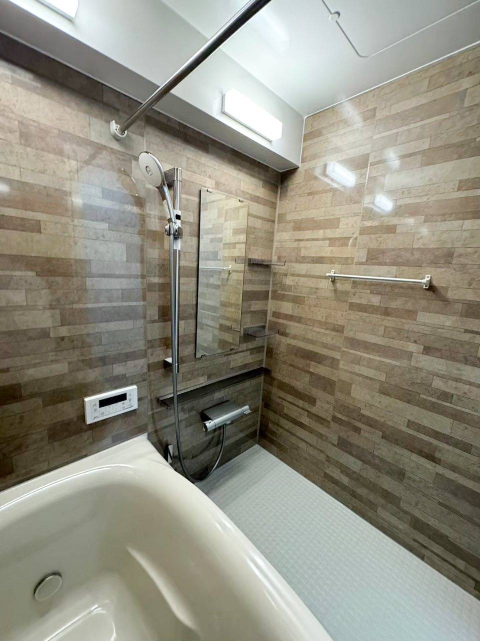 LIXILのシステムバス、「リノビオV」を施工。 天然石をイメージしたセブストーン柄の壁面パネルがとても素敵です。