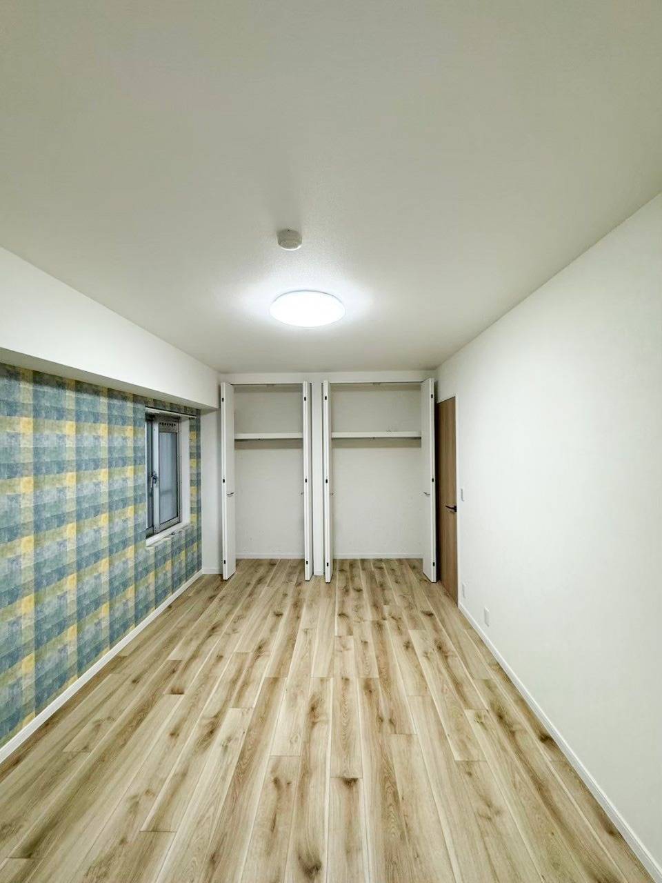 お客様がお選びになったアクセントクロス。ブルー×イエローのチェック壁紙クロス。お客様のデザインされた洋室です。