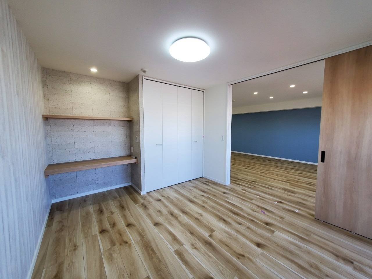 リビングルームから見た洋室です。引き戸を開けると目の前にはオシャレなグレーベージュ木目調のアクセントクロスが。