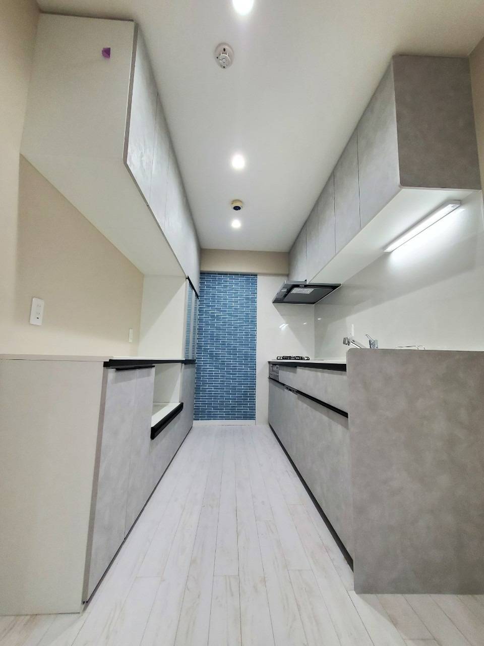 こちらのキッチン、どこに立ってもグレーとブルーの配色が見えるように工夫されております。