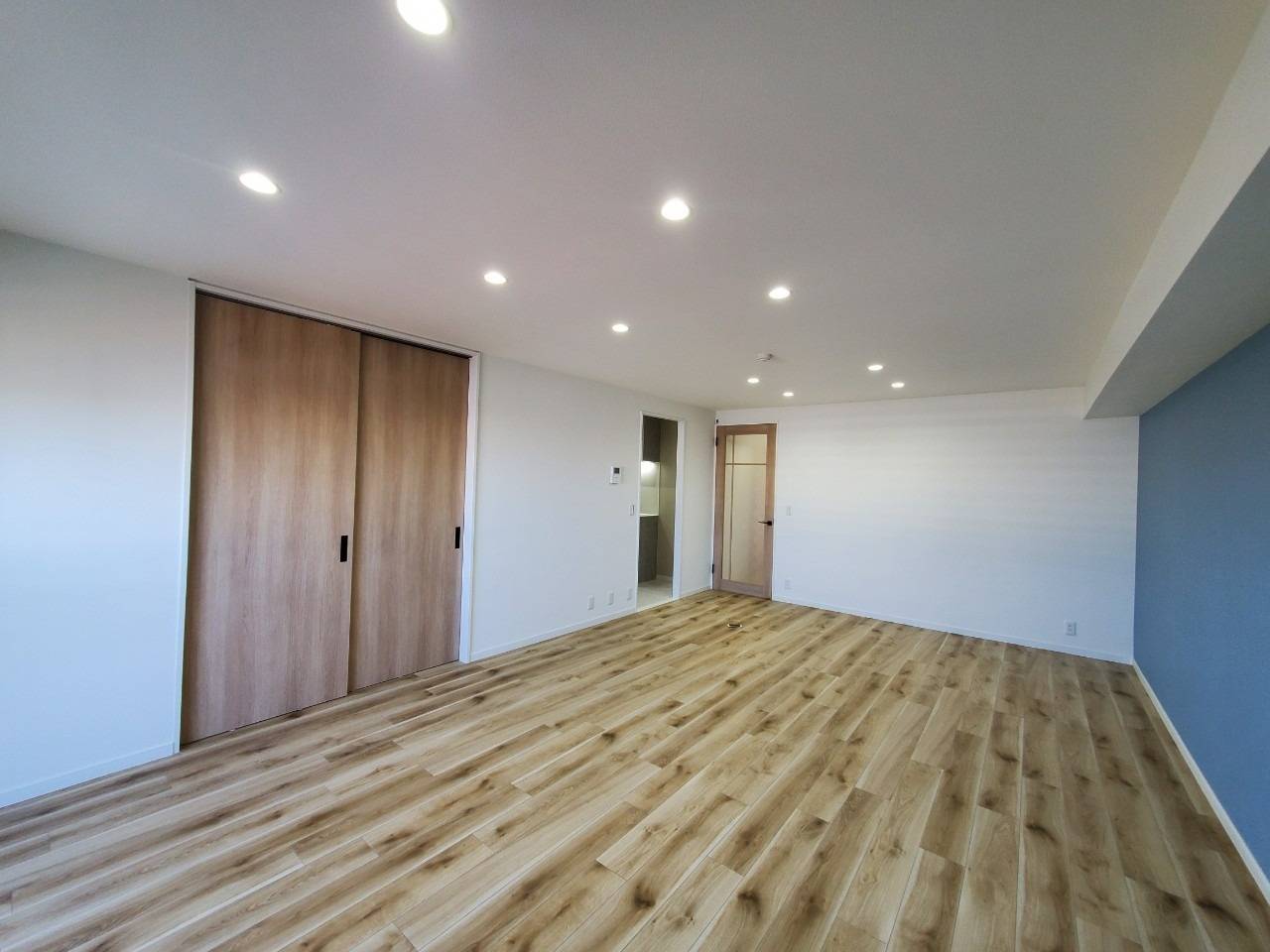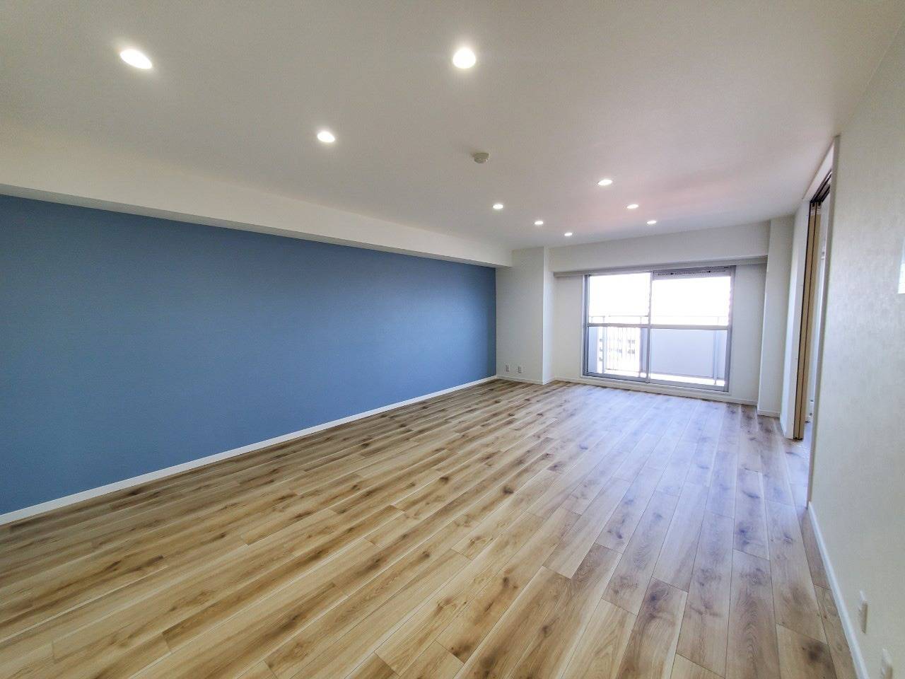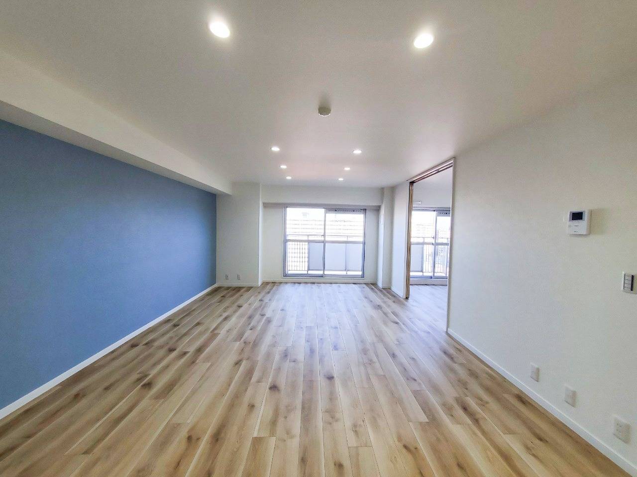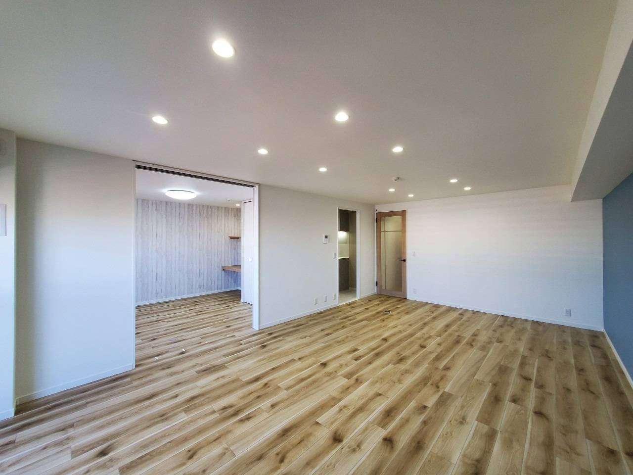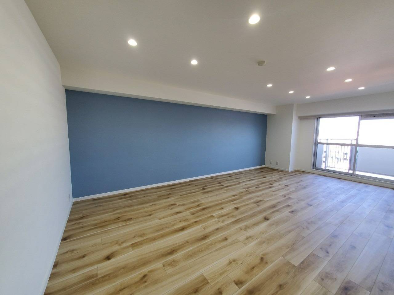 リビングルーム、ブルーアクセントクロス側から見た状態がこちら。