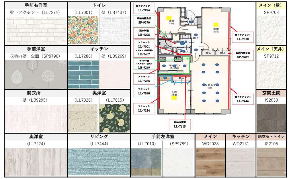 ドア、クローゼットの建具、コンセントのデザインから位置までを全てお客様と確認し、この図のように書類上にまとめ、施工前にお客様と最終確認を行います。