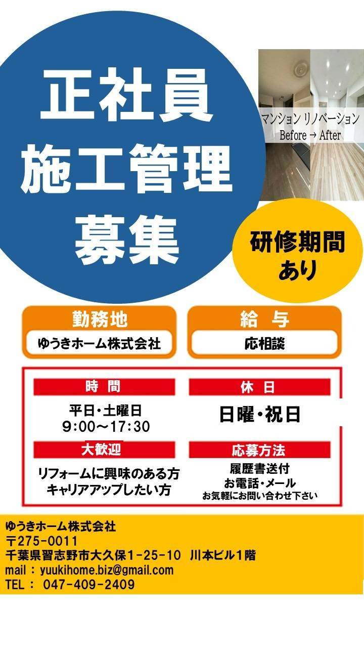 求人 ゆうきホーム株式会社 正社員 募集 施工管理 千葉 習志野 船橋