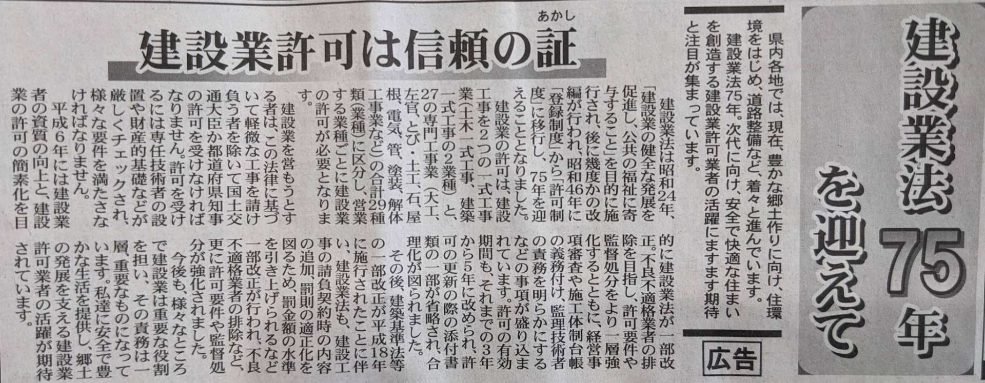 ゆうきホーム株式会社 が 毎日新聞 に 掲載されました。「建設業法75年を迎えて」という特集です。