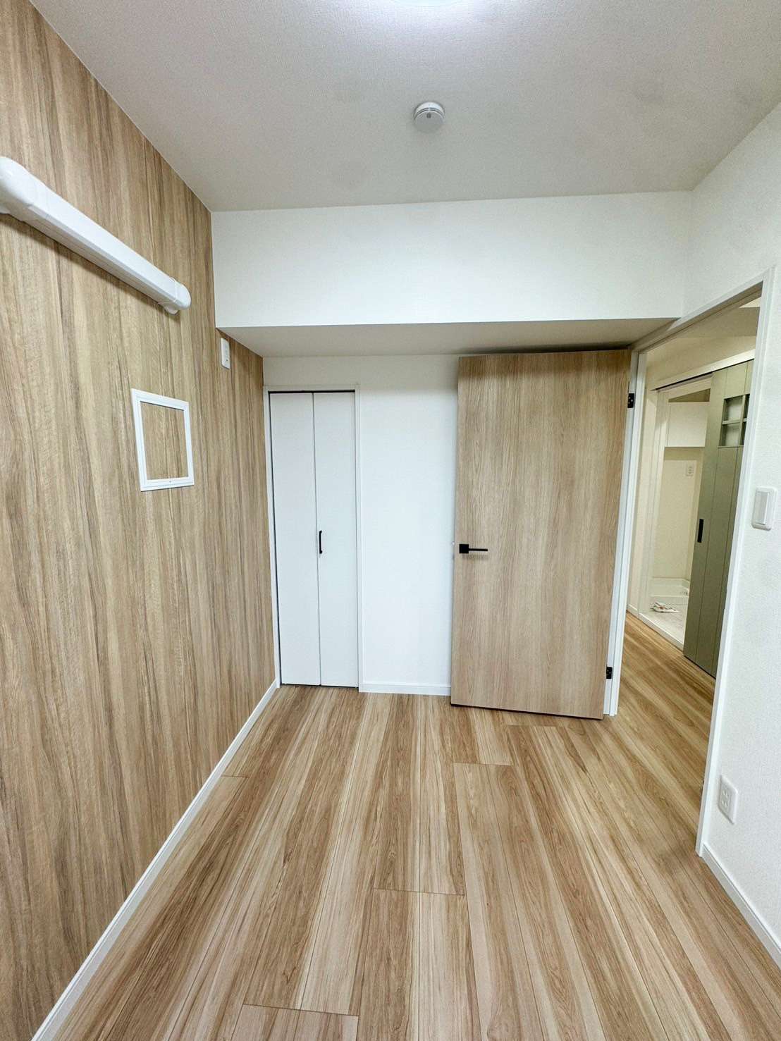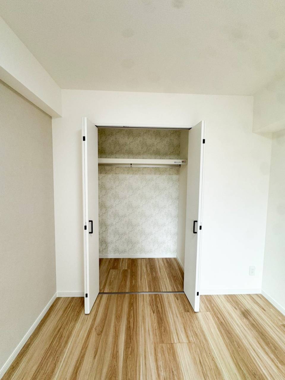 和室の押入れが、おしゃれな洋室の収納クローゼットに生まれ変わりました。 クローゼット内部は床フロアは洋室床フロアとつながりを見せるように施工し、クローゼット開き戸を開くと、お部屋全体をさらに広く見せられるように工夫いたしました。 壁紙クロスも背面はアクセント壁紙クロスに◎