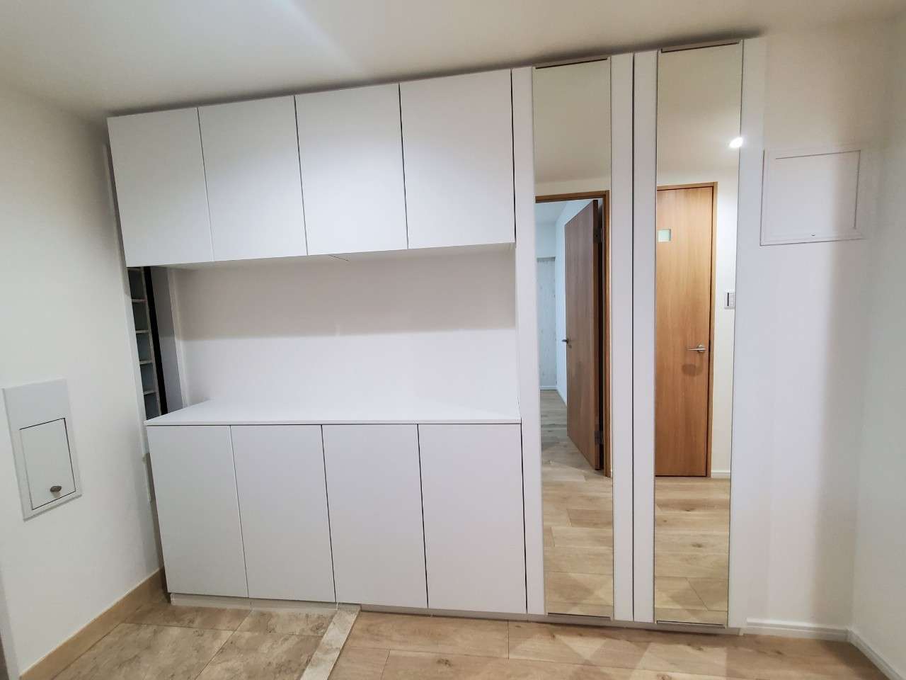シューズボックスには天井高の鏡を2面設置したことにより、さらに玄関を広くみせることができました。
