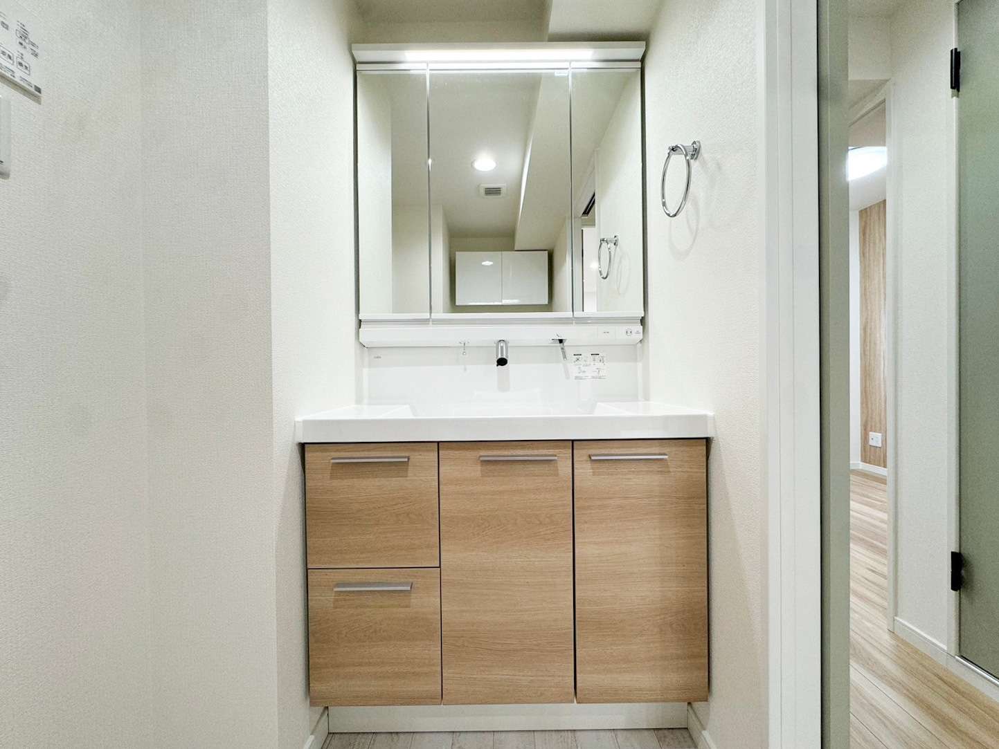 床・フロアタイルは白ホワイトウッド調でLIXIL洗面化粧台のブラウンウッド調と相性抜群。