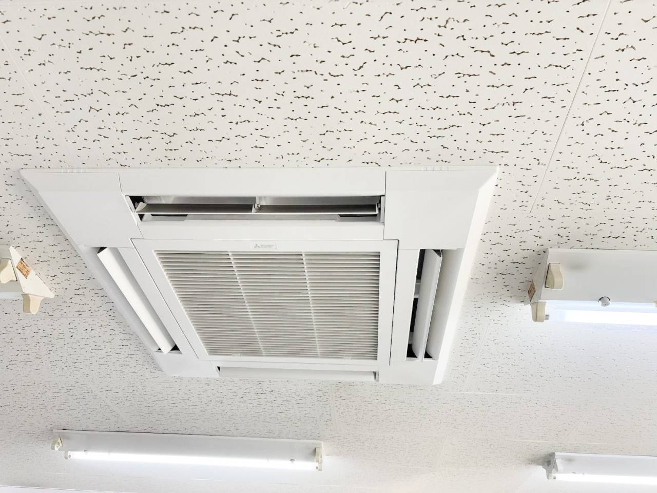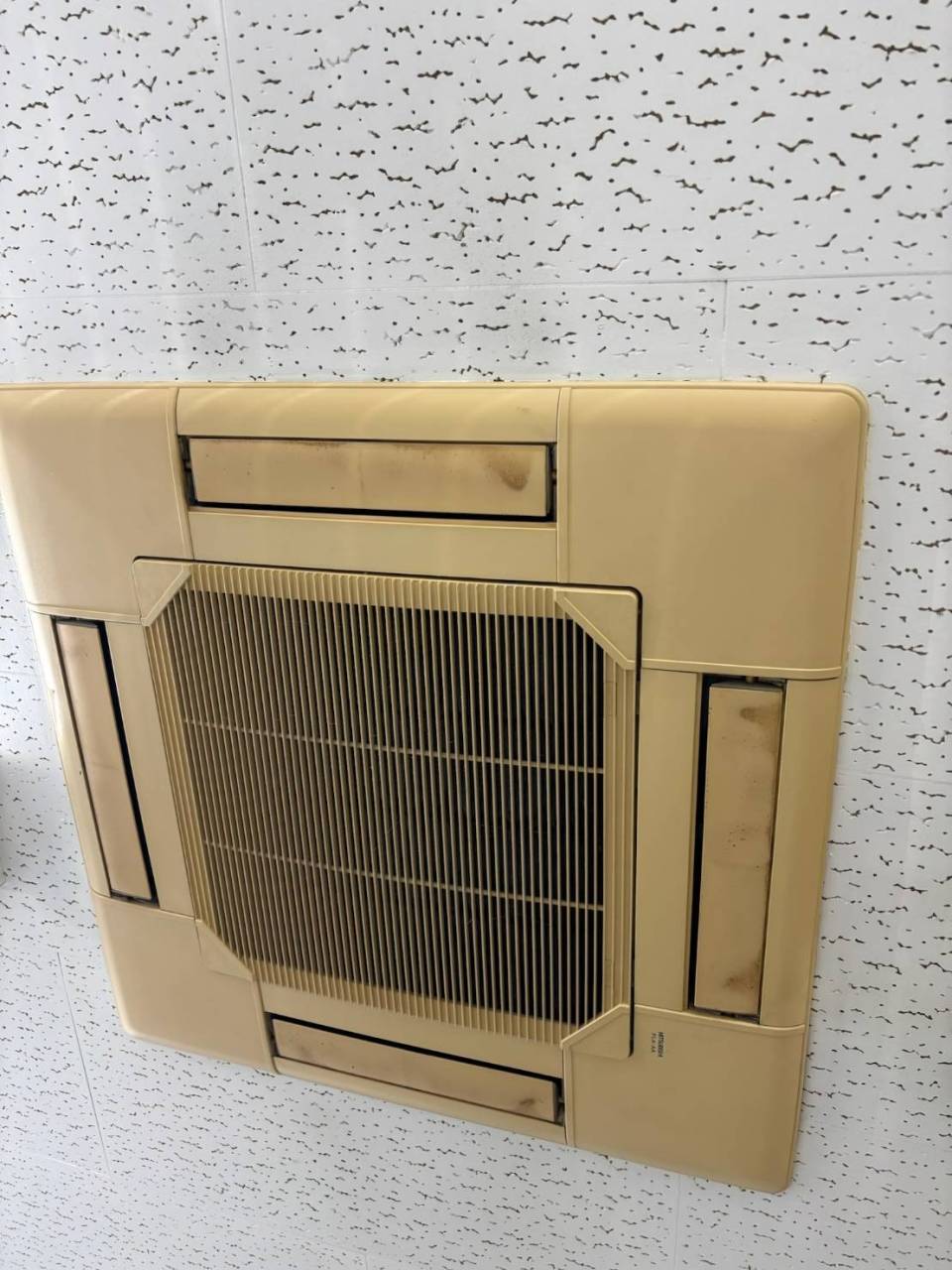 当初、当社のスタッフが駆け付けた時のエアコンがこちら。天井埋め込み式の業務用のエアコンです。このようなタイプのエアコンは自分でできるお手入れや掃除が限られているものがほとんどで、外側やフィルターの掃除できるものの、内部の掃除や点検はプロへの依頼が必須です。天井の高さに設置されているということもあり、なかなかこまめな清掃も難しいですよね。長年活躍してきたエアコンの色あせや汚れも目立ちますね。