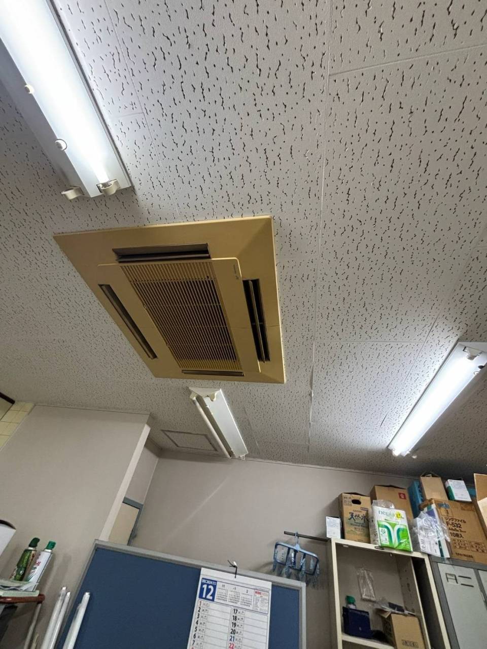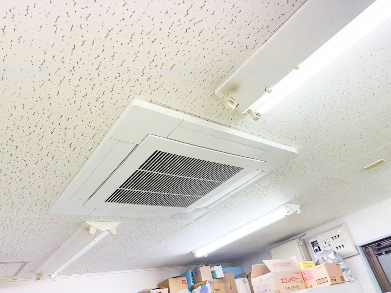事務所の天井や壁紙と比べてみてもエアコンがひと際古い印象を受けます。天井をじっくり見ることってあまりないかもしれませんが、いざ変わると印象がガラッと変わりますよ!