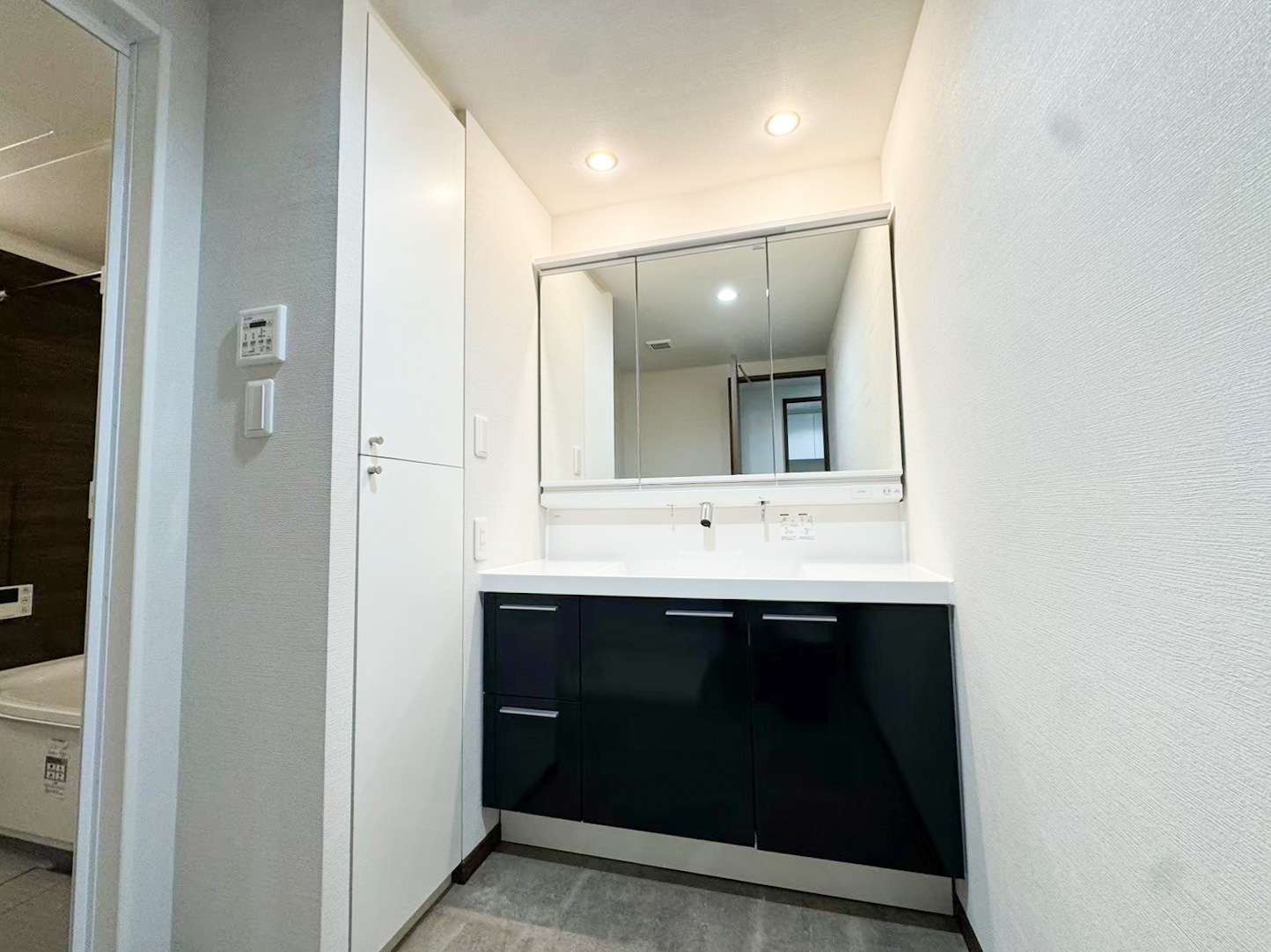 横幅いっぱいの大きな洗面化粧台。マンションの限られたスペースで十分に洗面スペースを設けられるのはうれしいですよね。