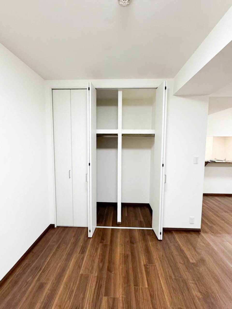 真っ白な壁と天井、収納ドアにウォールナットのフローリングが高級感のあるリビングを演出してくれています。
