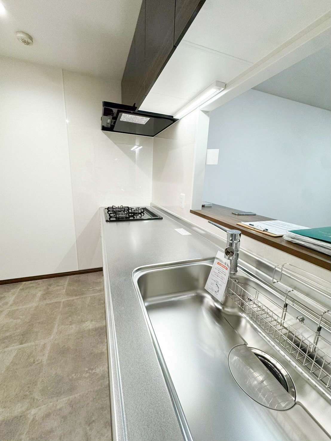 床材に少し柄のあるタイプを選んだので、壁や吊戸棚は清潔感のある真っ白に。