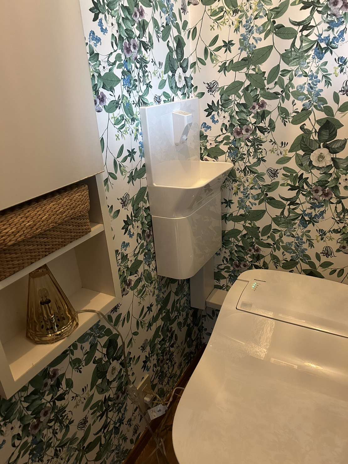 便器はタンクレスのスタイリッシュなデザインのもののため、より柄クロスを引き立ててくれています。