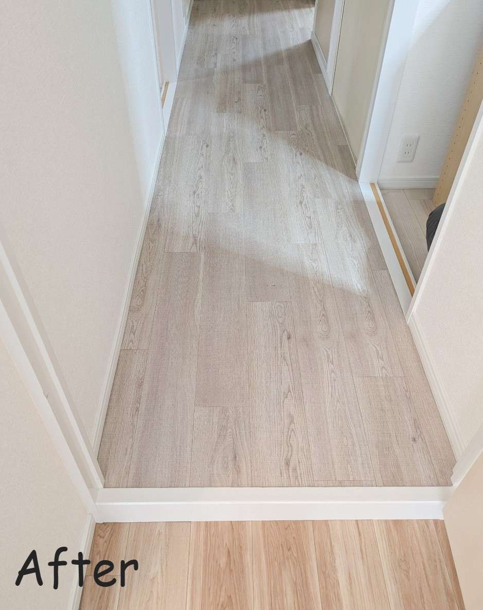 まずは廊下から見てみましょう! Beforeは玄関側からリフォーム前の廊下を撮影したものです。絨毯を敷き詰めている絨毯はどうしてもつなぎ目や汚れが目立ちますね。一方でAfterを見てみると明るいイメージのキレイなフローリングが玄関からリビングまで続いています。