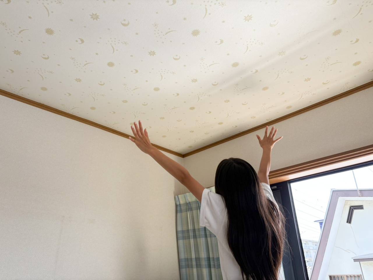 こちらは白色ベースの天井クロスに、月や星のモチーフを組み合わせた上品なデザイン。 月と星の模様がすべて蓄光仕様になっており、夜になると、天井一面に優しく光が広がります。 照明を消すと、月がふわっと浮かび上がり、その周りに小さな星が瞬いて…。 読書が趣味な お姉ちゃんが本を閉じて寝転がりながら、静かに空を眺めている様子は、まるでおとぎ話のワンシーンのようですね。普段はおとなしいお姉ちゃんとのことですが、お部屋全体の壁紙クロスが変わりお部屋がキレイになったことはもちろん、貼り替えた天井の月星模様の壁紙クロス、蓄光クロスに大喜びしていただき、スタッフや職人さん達も大喜び☺