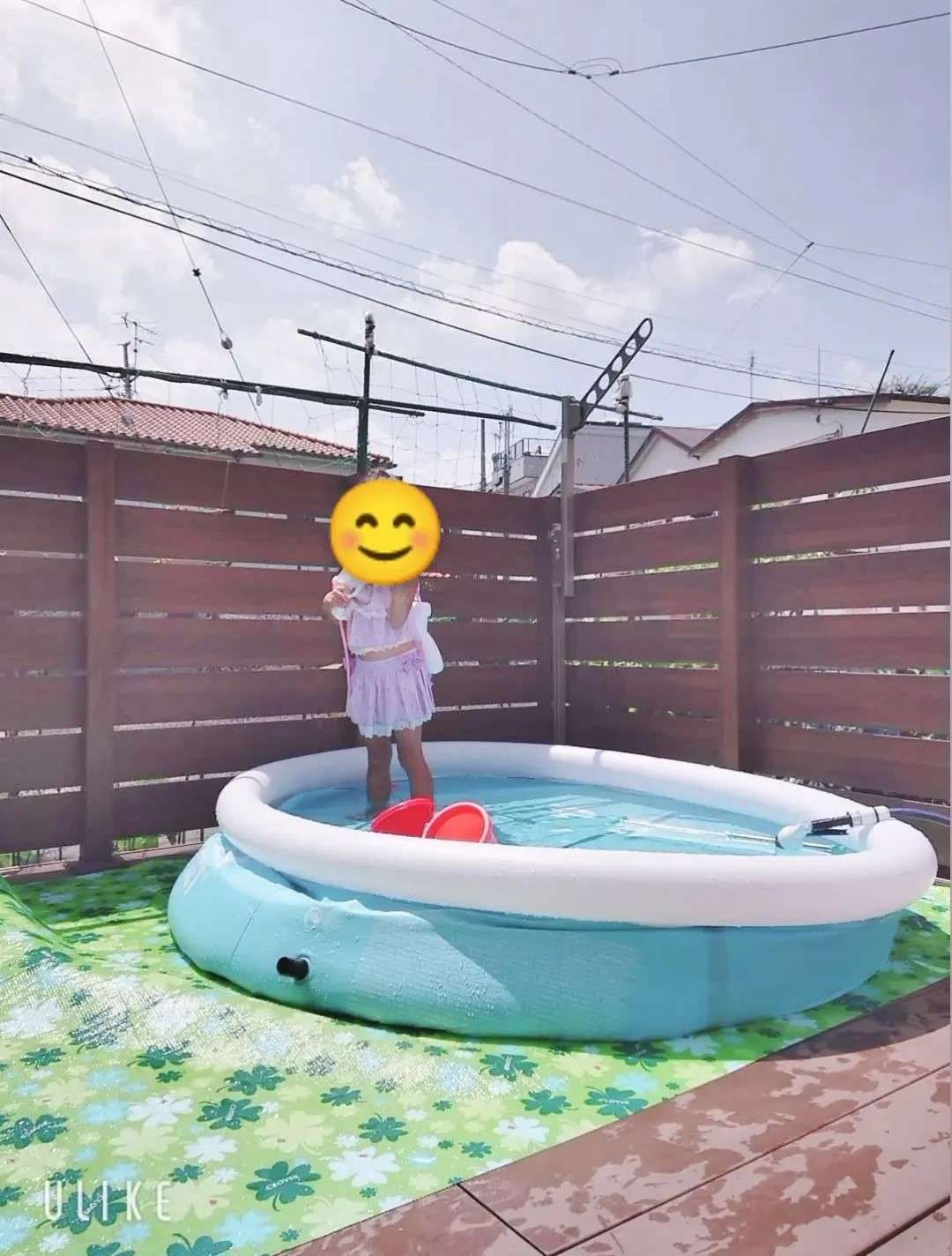 2つ目のご紹介は、ウッドフェンスに囲まれた中庭にビニールプールを置き、思いきり夏を満喫しているお子さまの姿です。