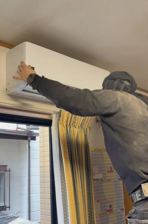 全身を横にし、わずかな隙間で6mの冷媒配管を正確に通す姿。 プロ中のプロにしかできない技術です。
