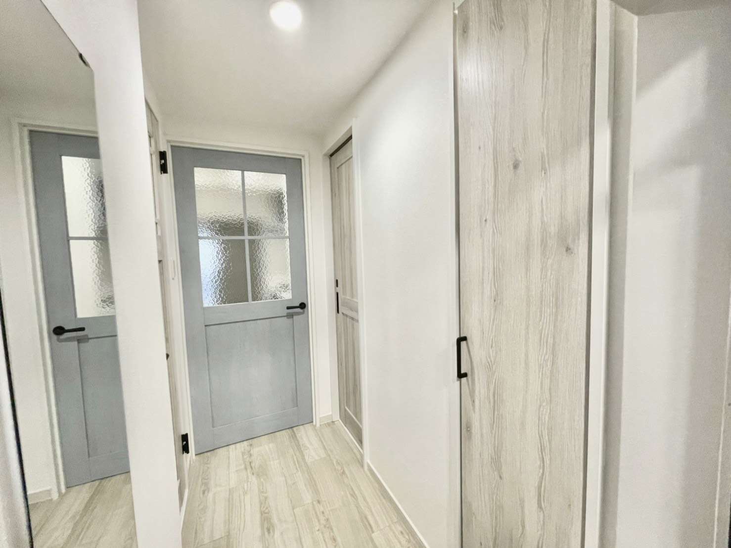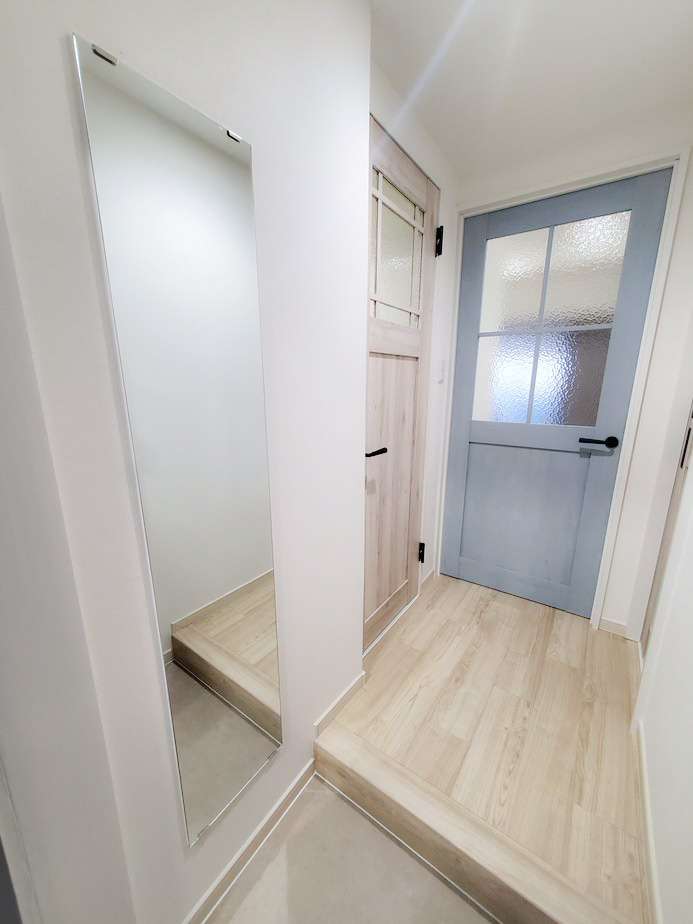 玄関周りはインスタ映え、コーディネートスペースに。全身ミラーの背景バックはコーディネートが合わせやすい白、玄関の為、靴を履いた状態での全身コーディネート自撮りが可能です。