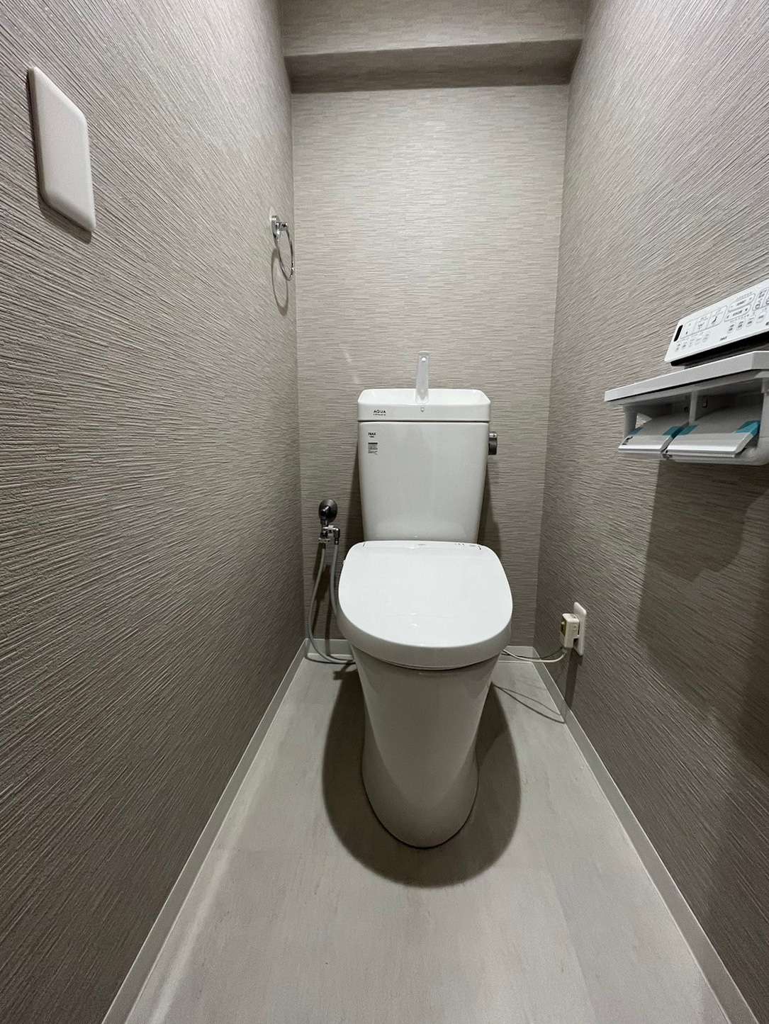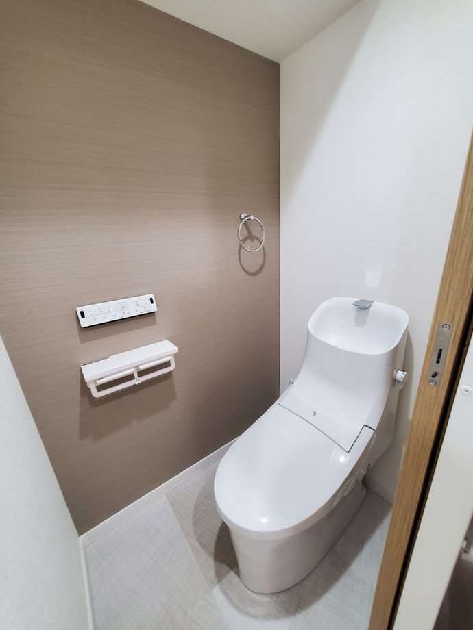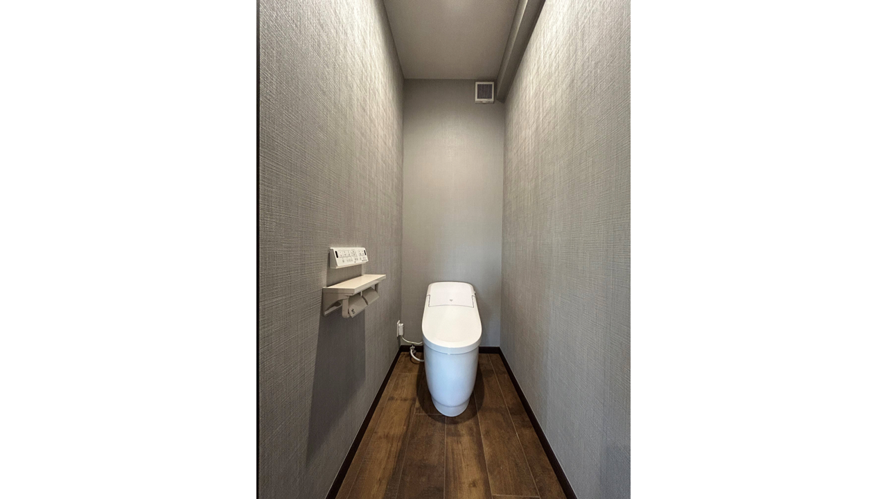 この空間に入ってまず目を奪われるのが、正面に配されたダークブラウンのアクセントクロス。 通常、トイレのような密閉された空間では膨張色が好まれる傾向にありますが、あえて奥の壁を深い色味にすることで、空間に驚くほどの奥行きと立体感が生まれています。